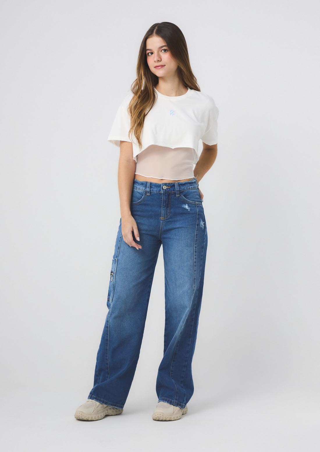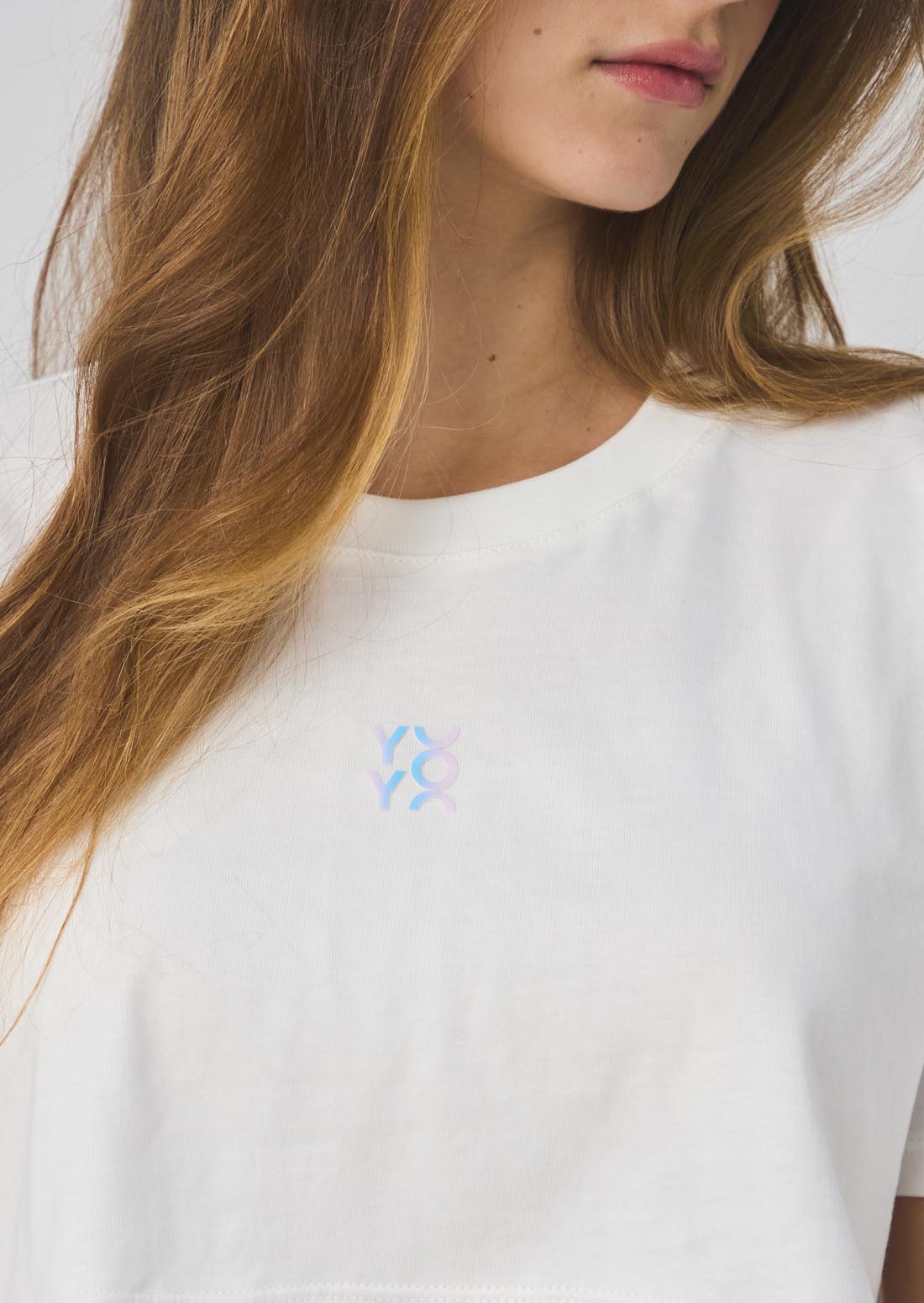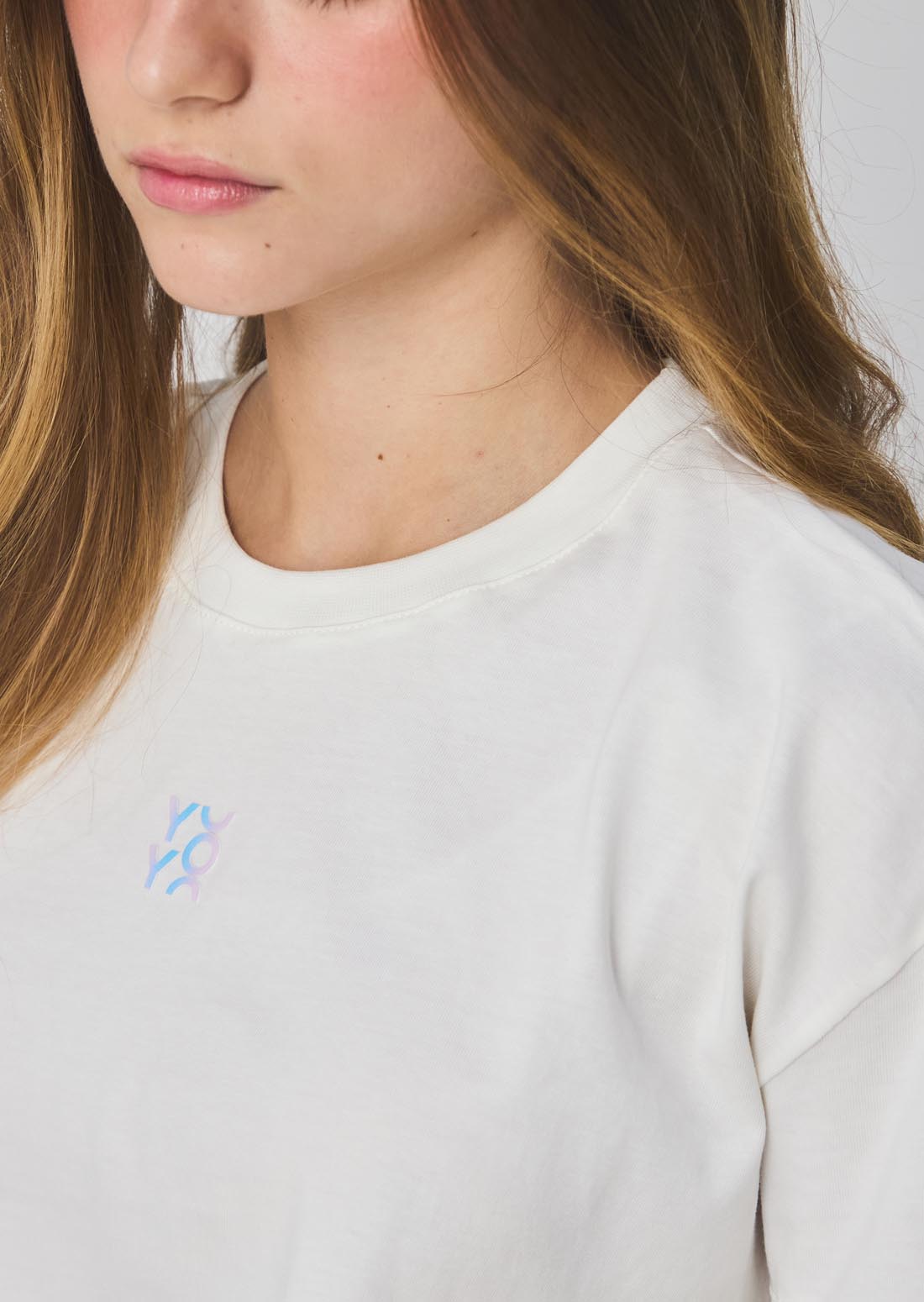 Camiseta manga corta, color marfil, con malla interna y estampado en frente para jóvenes.