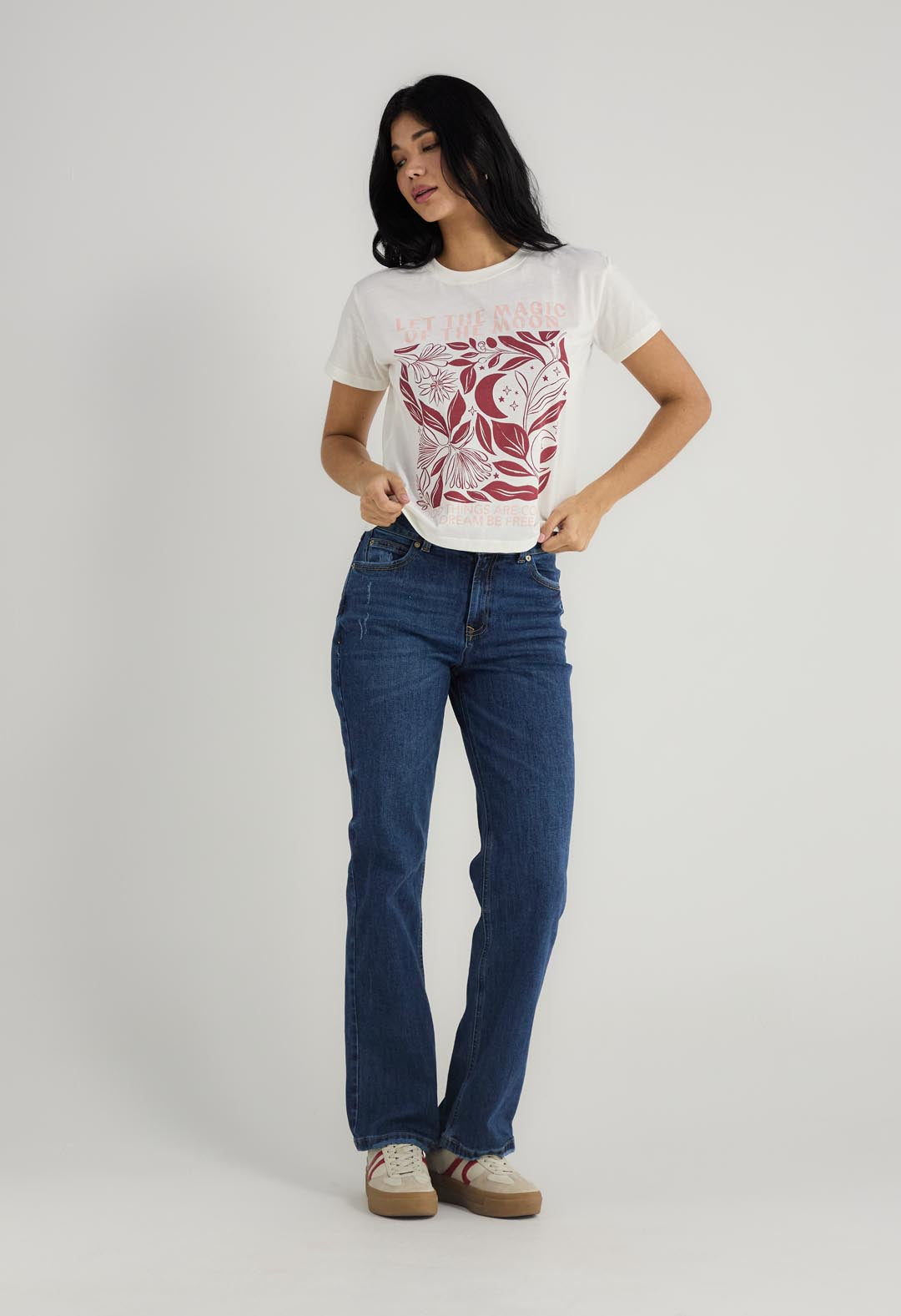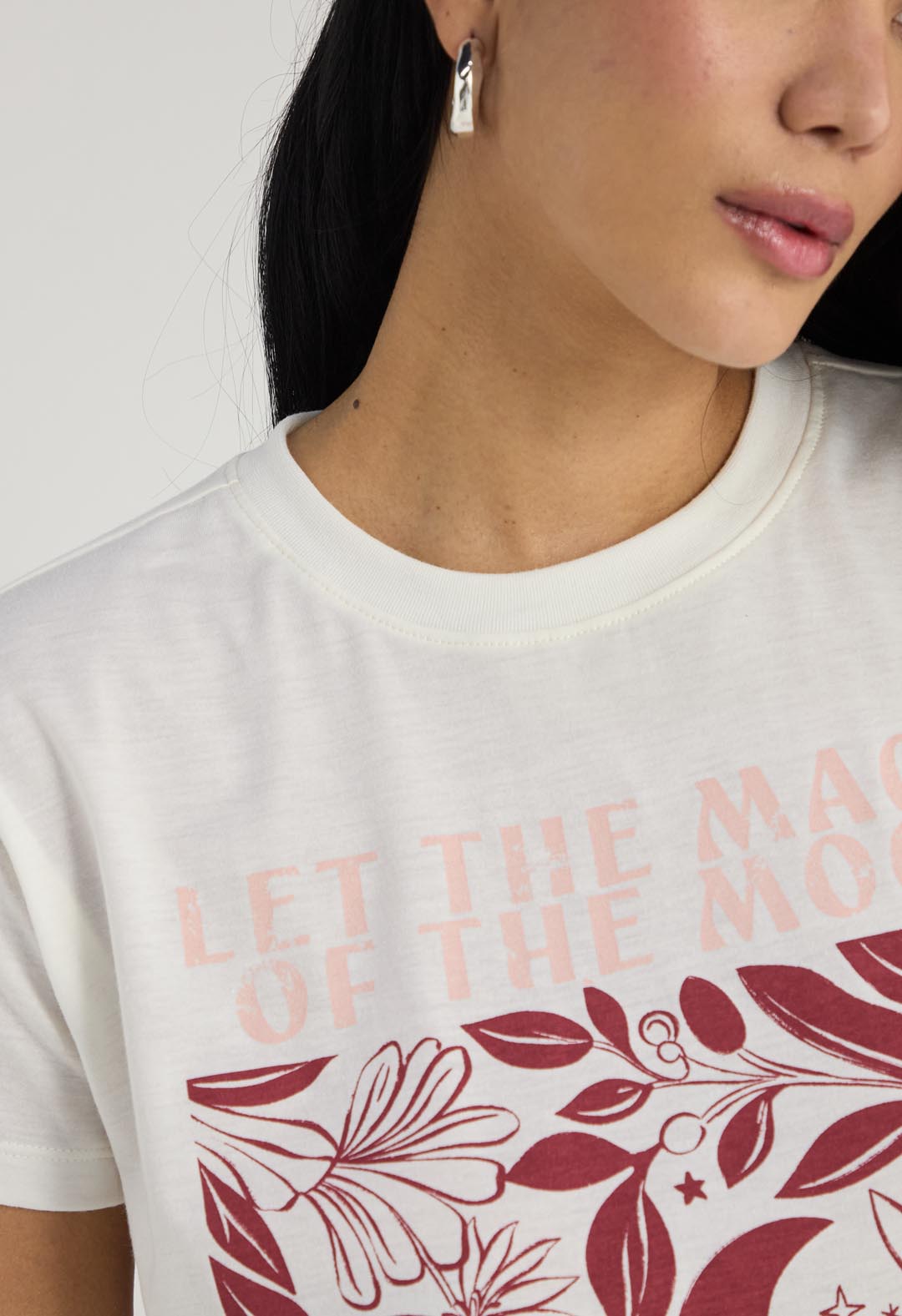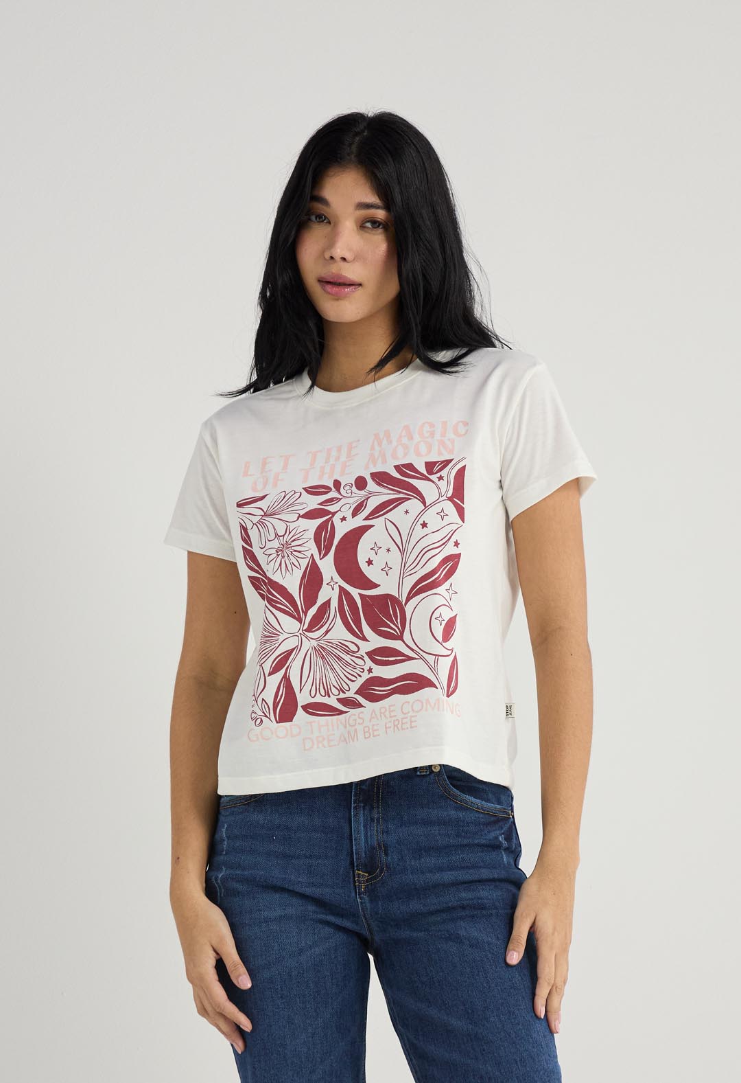 Camiseta manga corta, color marfil, cuello redondo y estampada para mujer.