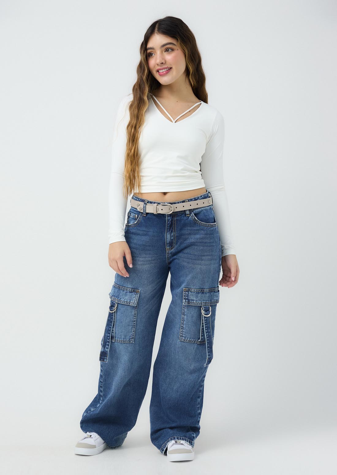 Camiseta manga larga, color marfil, con sesgos en frente y fondo entero para jóvenes.
