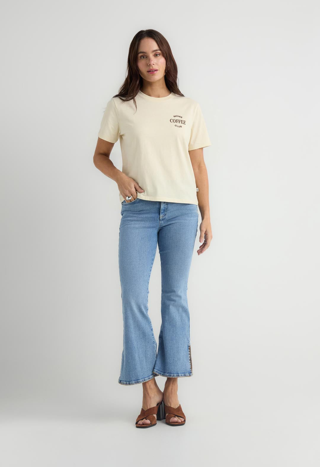 Camiseta de manga corta, color marfil, estampada y cuello redondo para mujer.