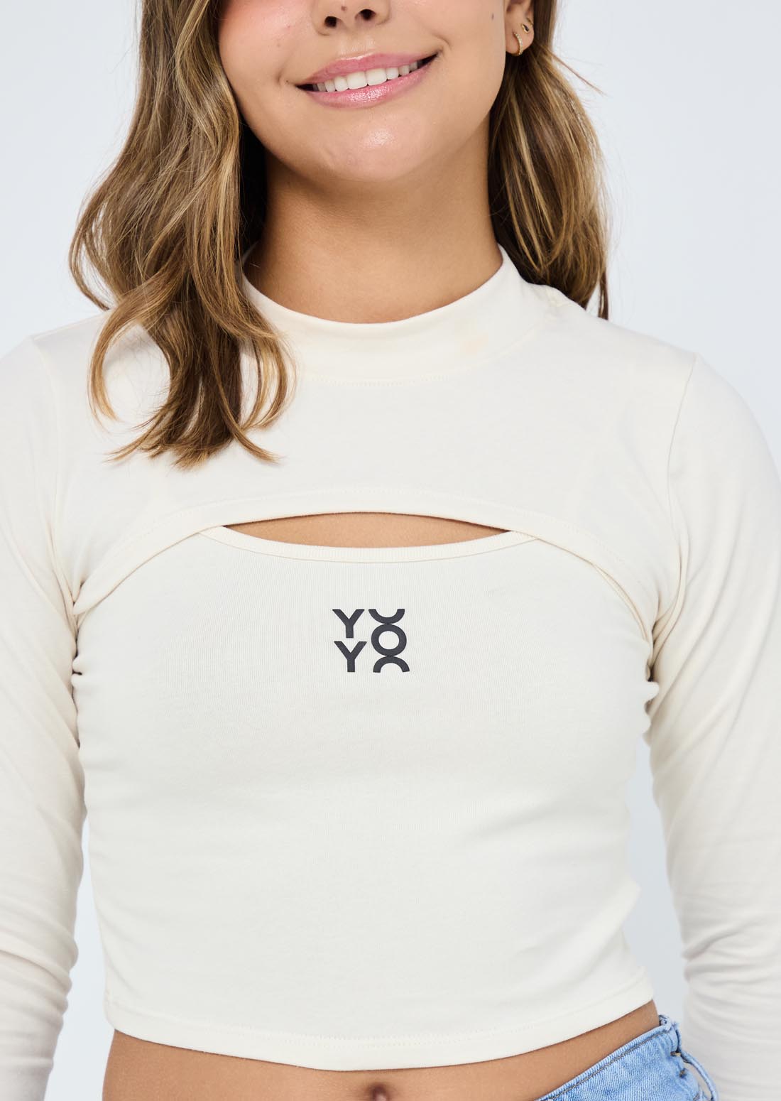 Camiseta manga larga, color marfil, doble prenda y estampado en frente para adolescentes.
