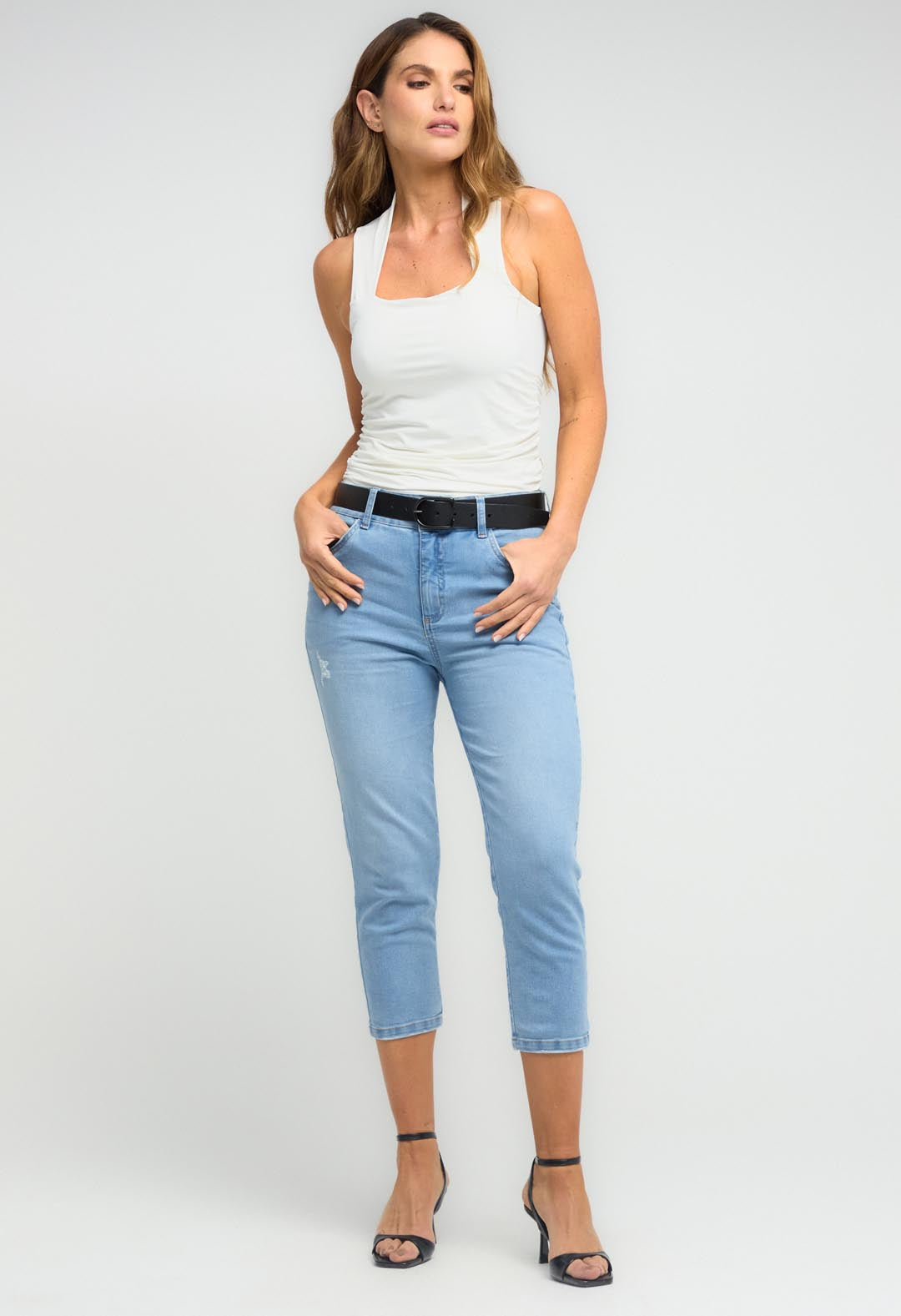 Camiseta manga sisa, color marfil, fondo entero, escote cuadrado y recogido en costados para mujeres.
