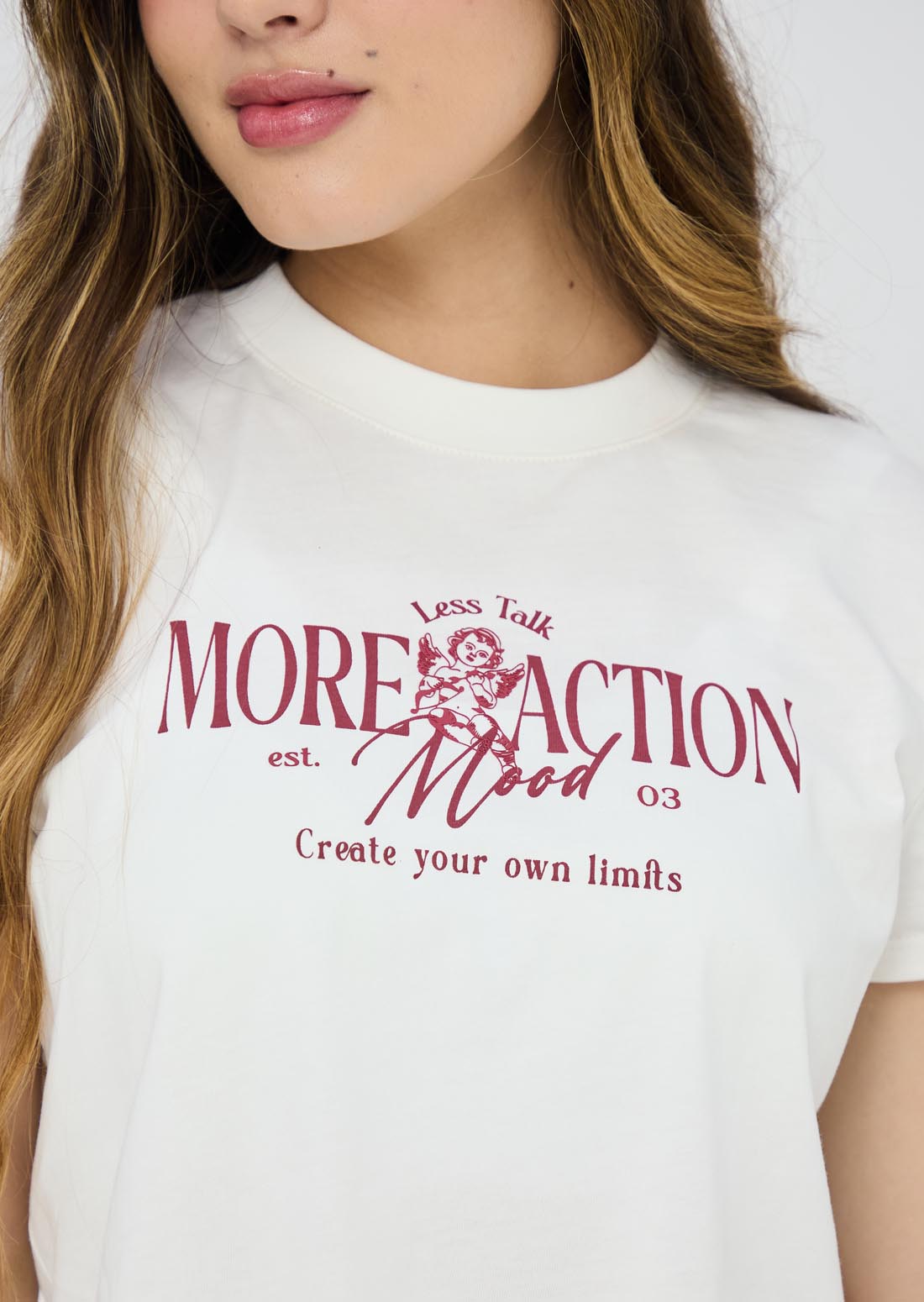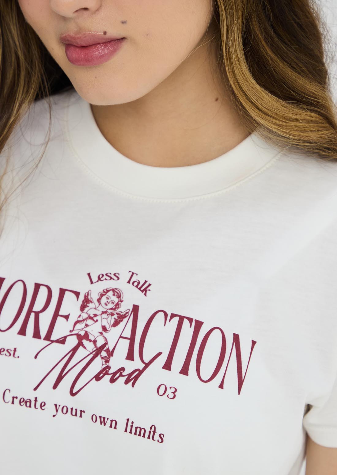 Camiseta manga corta, color marfil, estampado en frente y cuello redondo para jóvenes.