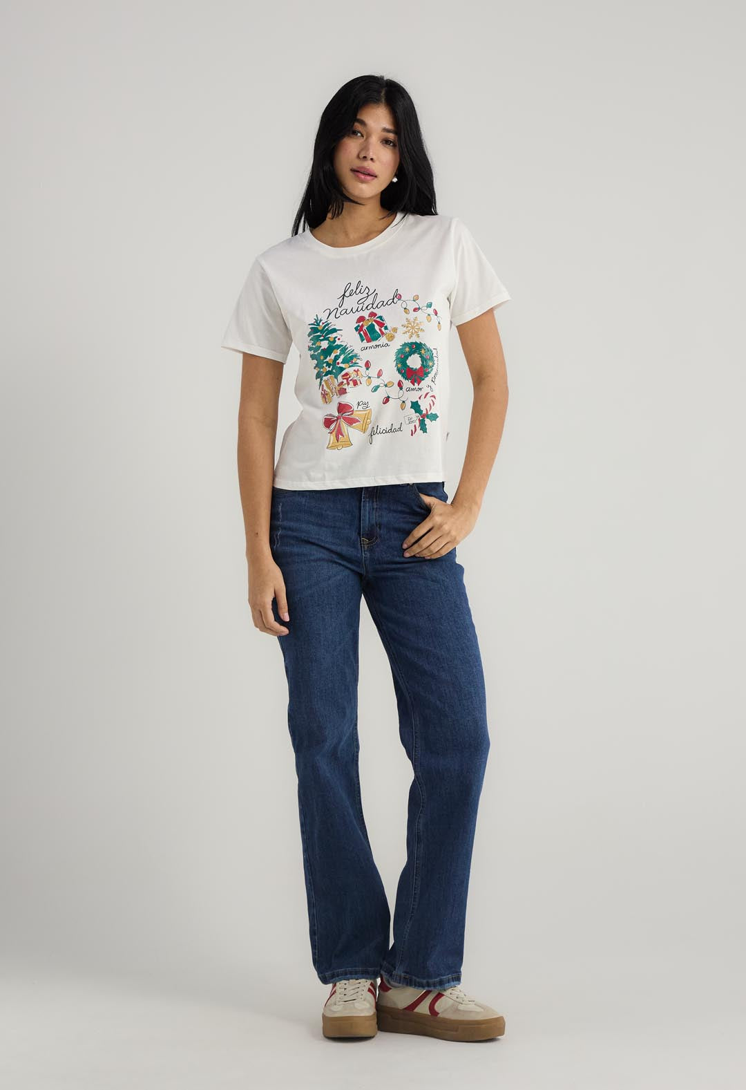 Camiseta manga corta, color marfil y estampado navideño para mujer.