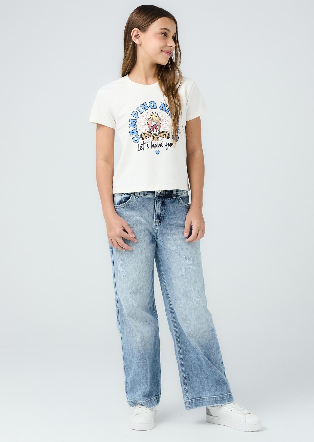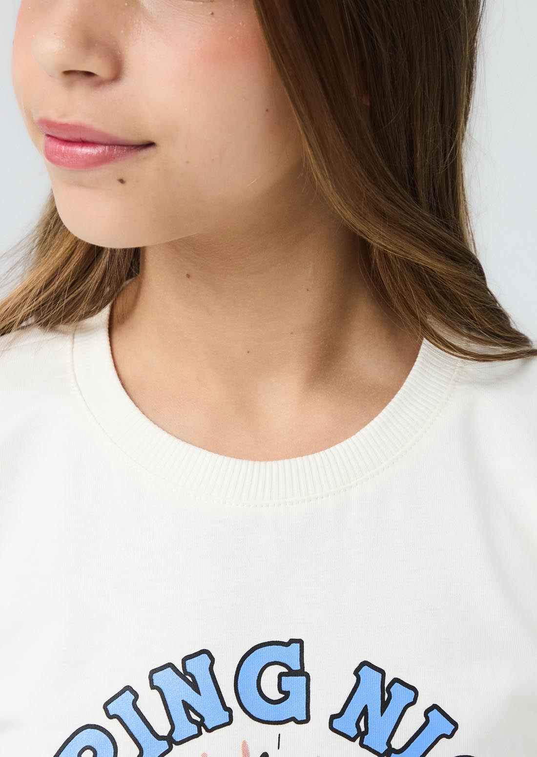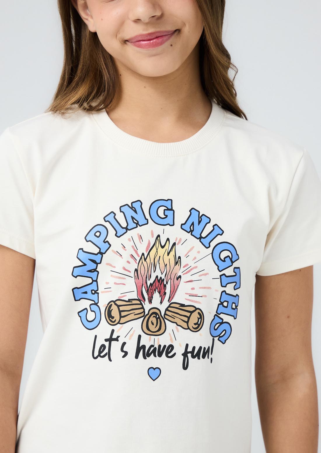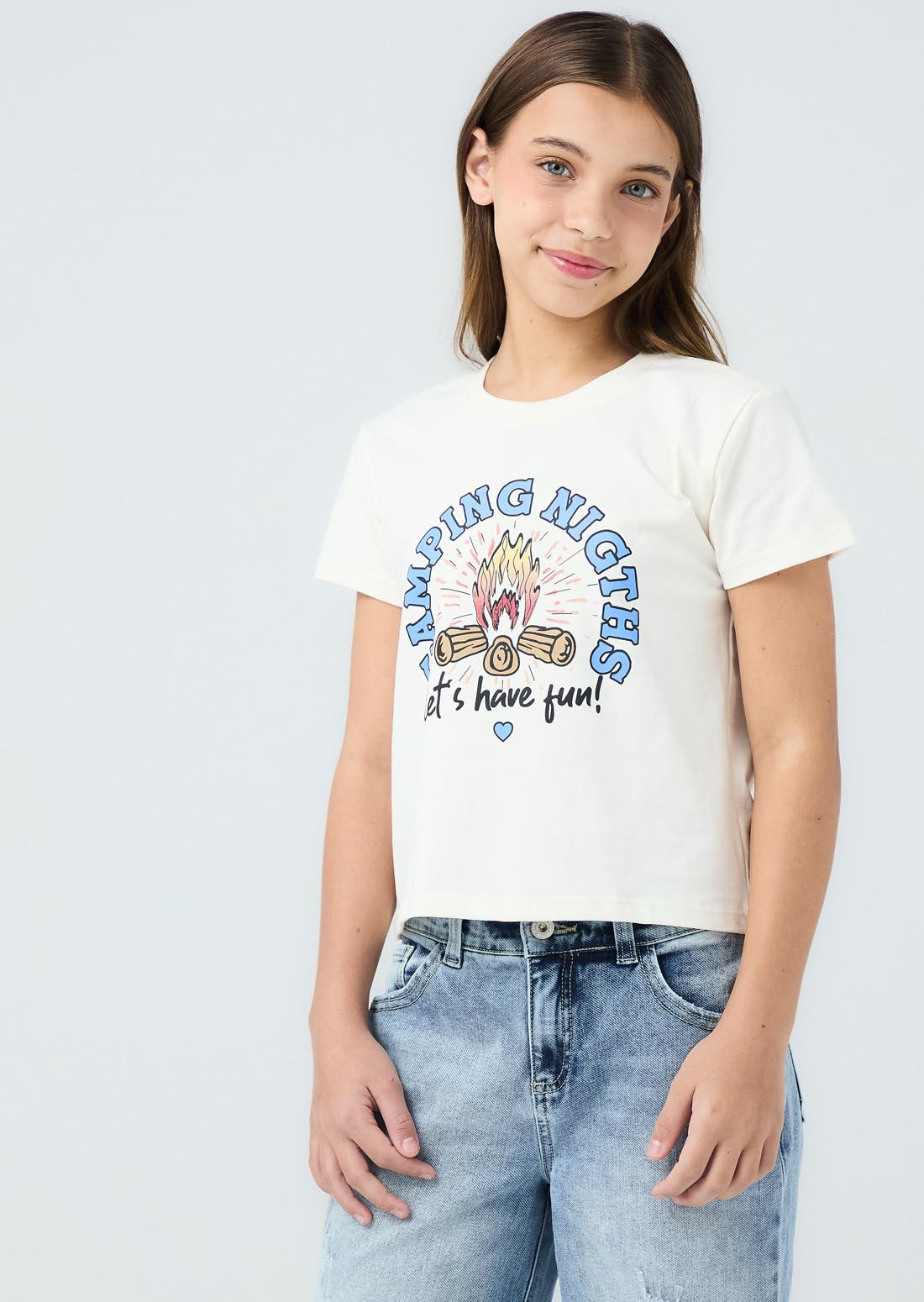 Camiseta manga corta, color marfil, cuello redondo y estampado en frente para niñas