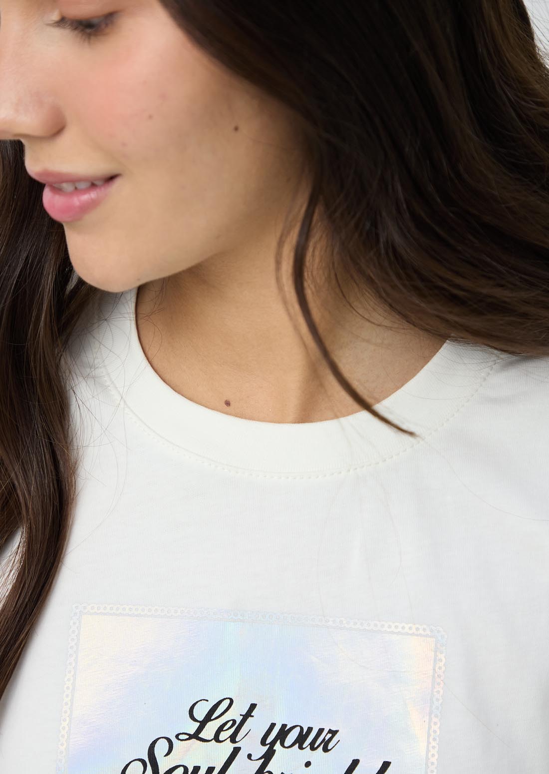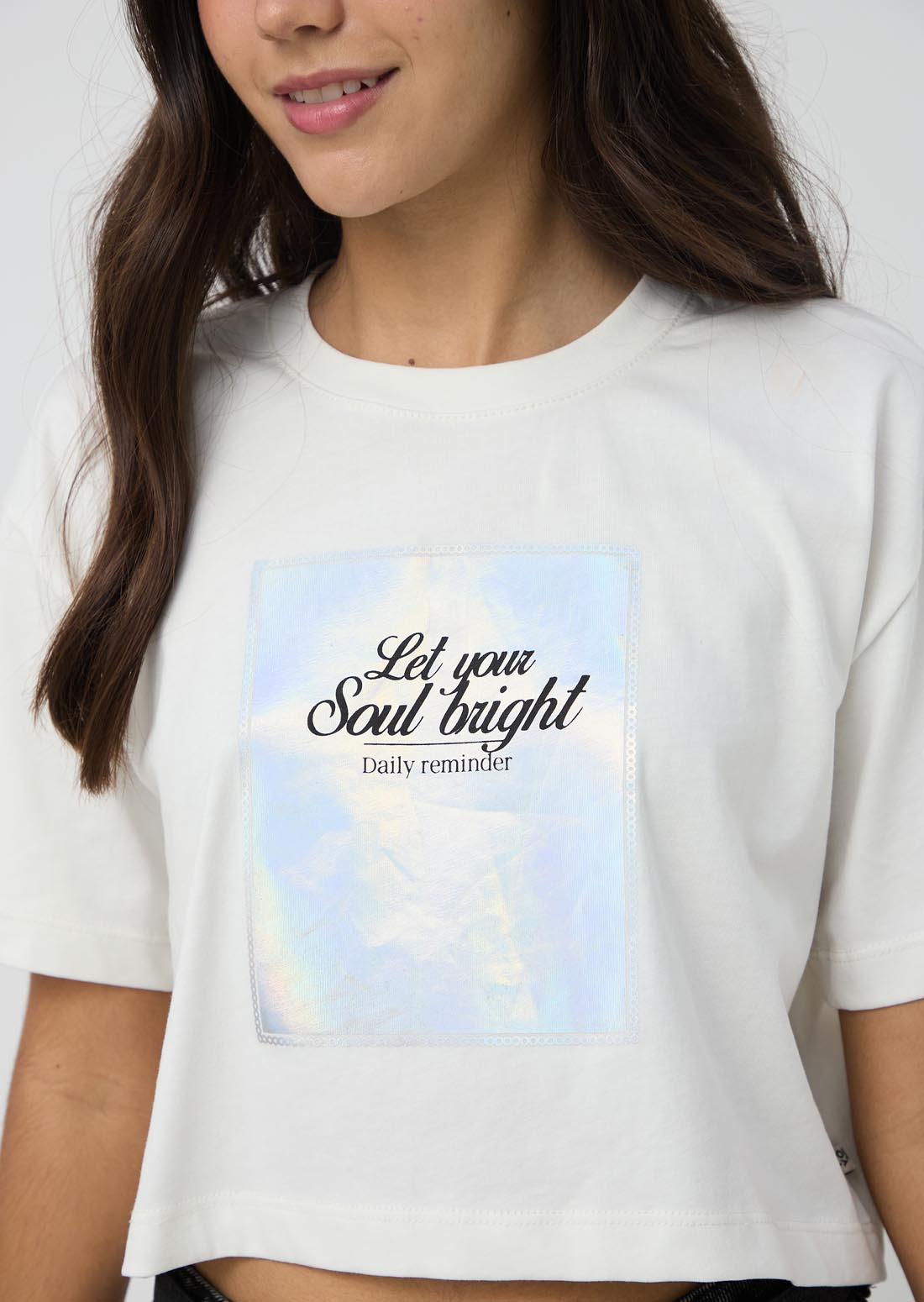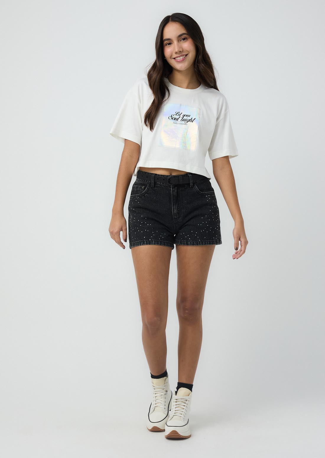 Camiseta manga corta, color marfil y estampado en frente para jóvenes.