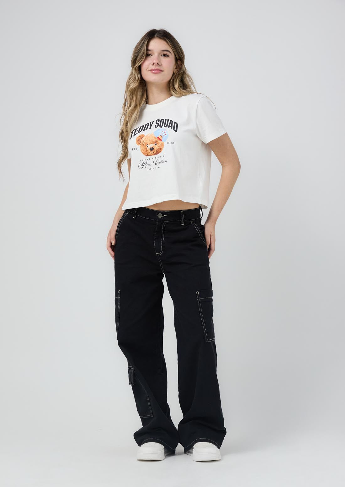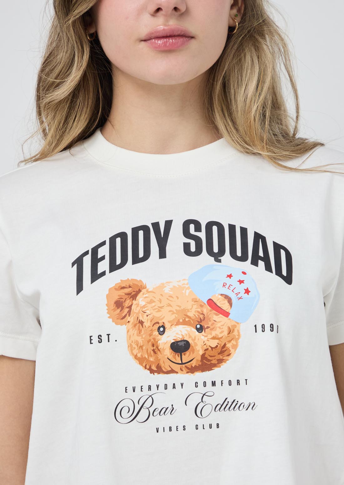 Camiseta manga corta, color marfil y estampado en frente para jóvenes.