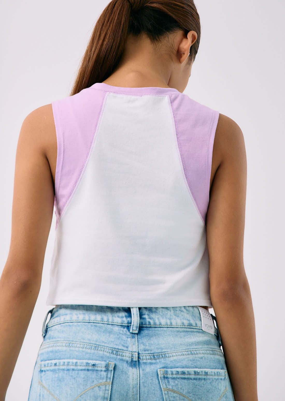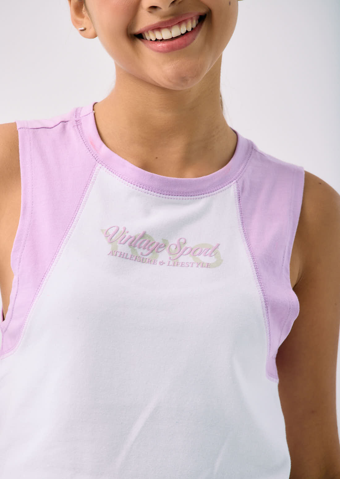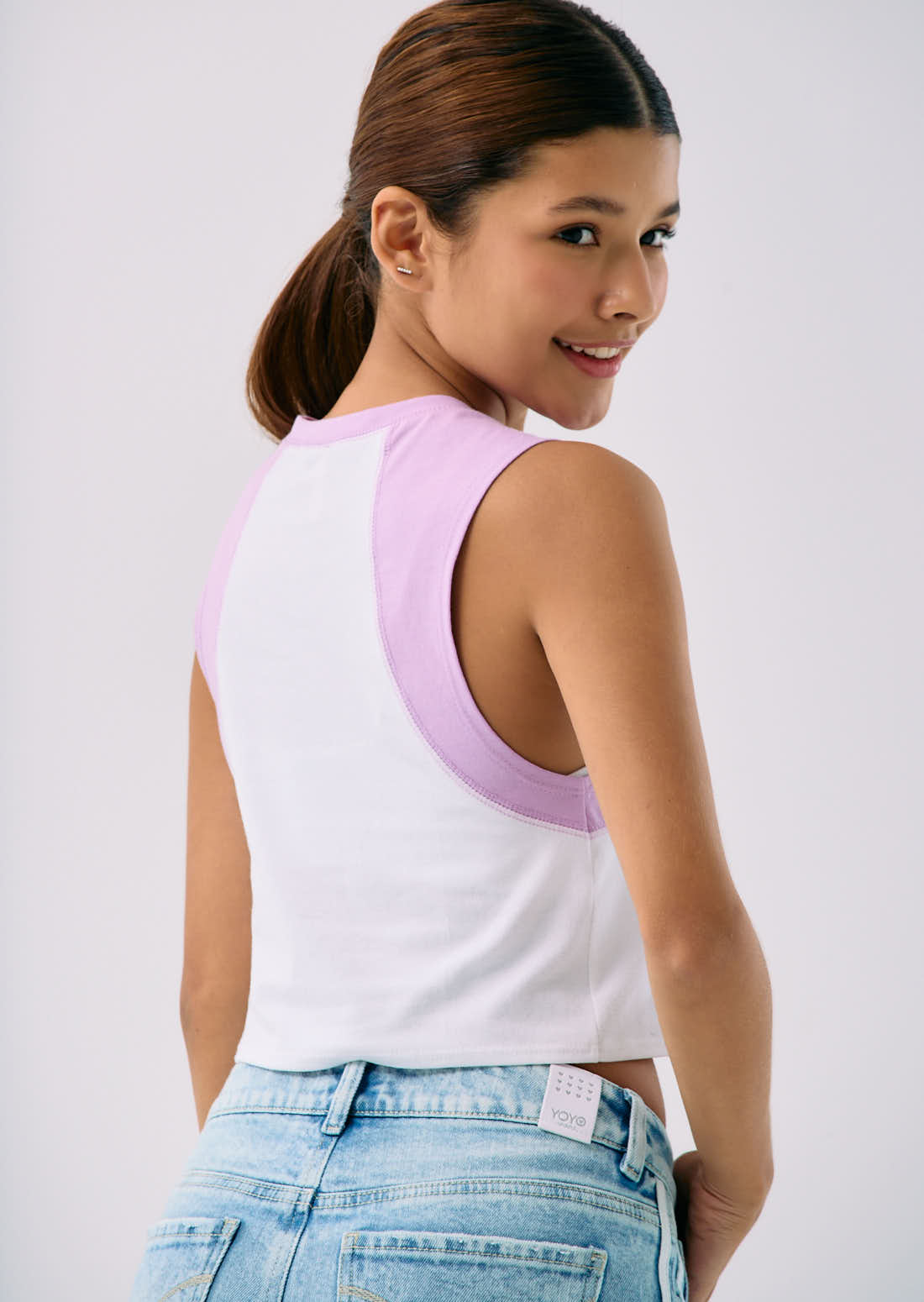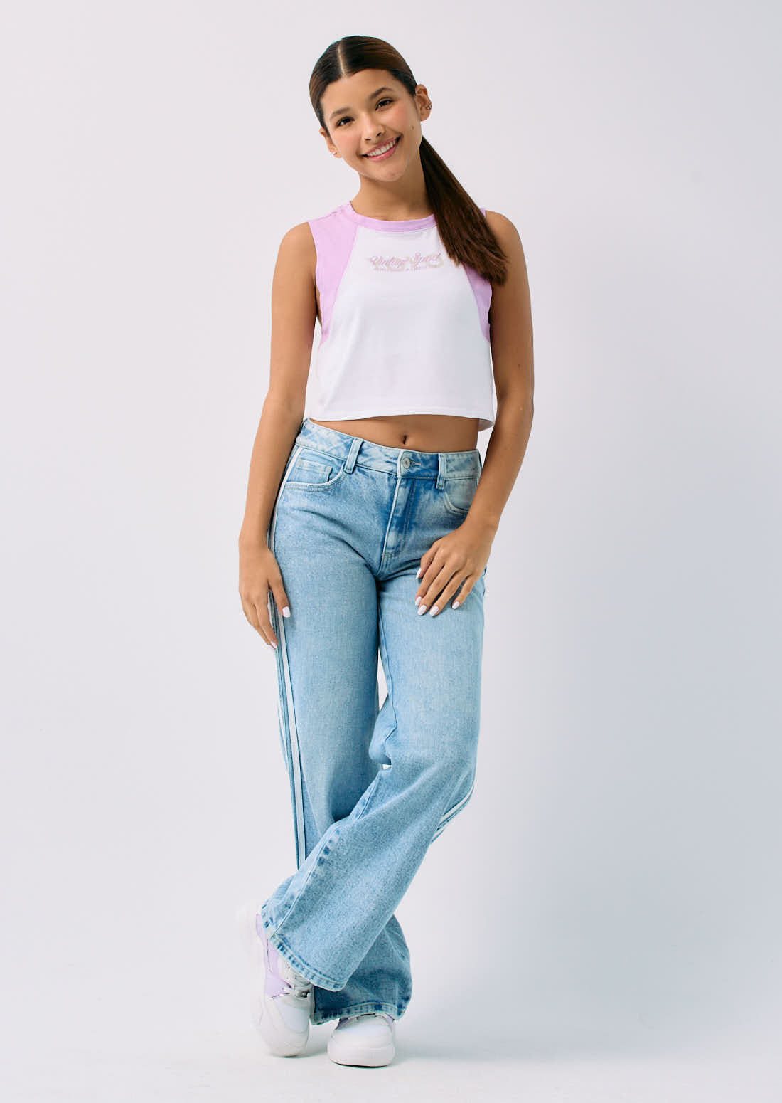 Camiseta manga sisa, color mora y estampado en frente para adolescentes.