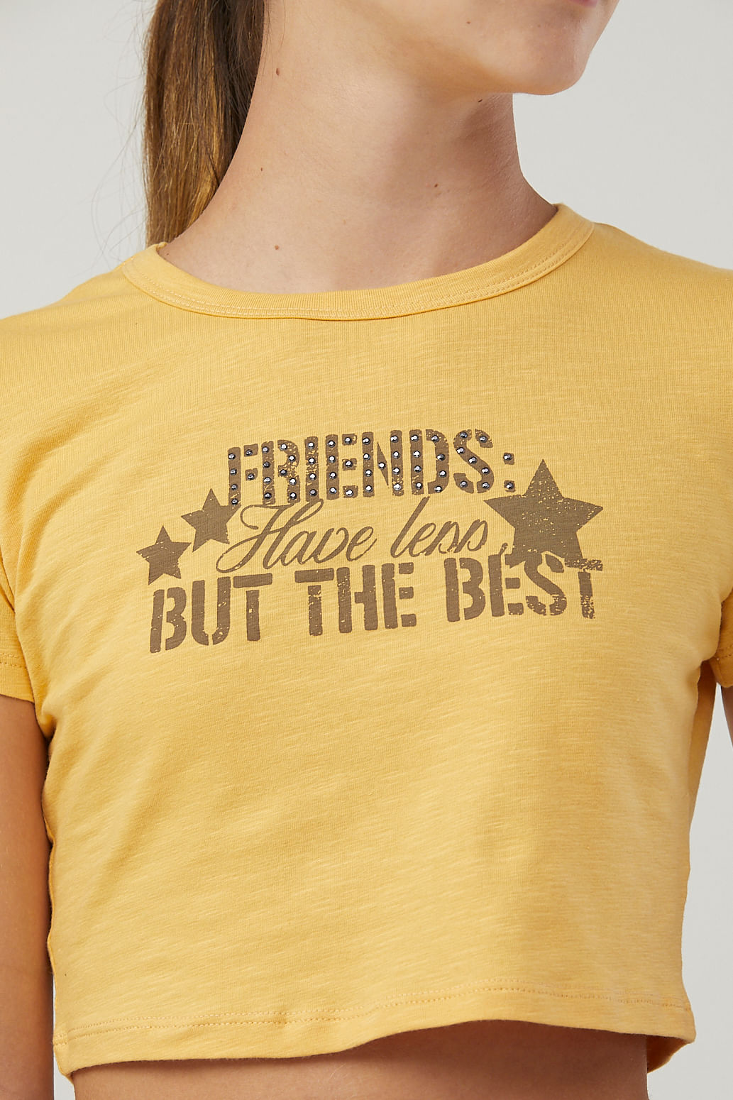 Camiseta manga corta, color mostaza, estampada en frente y espalda para jóvenes.
