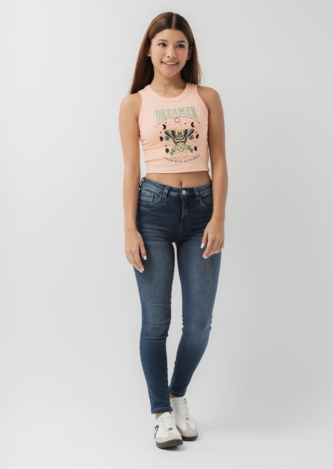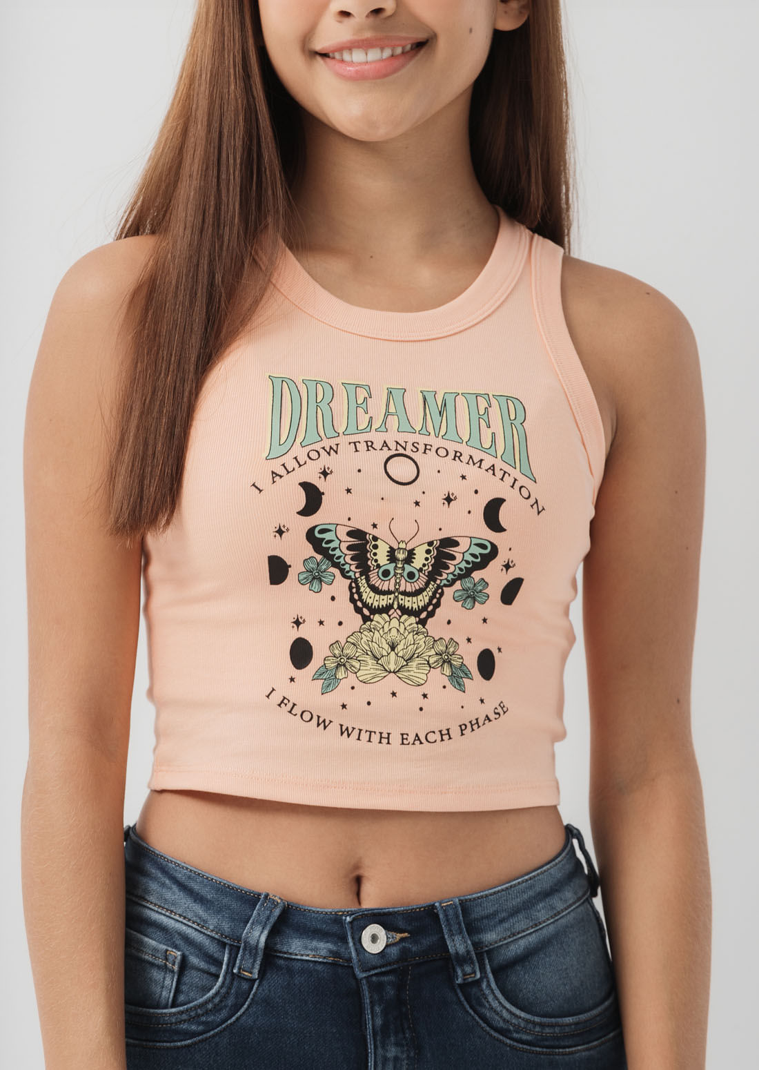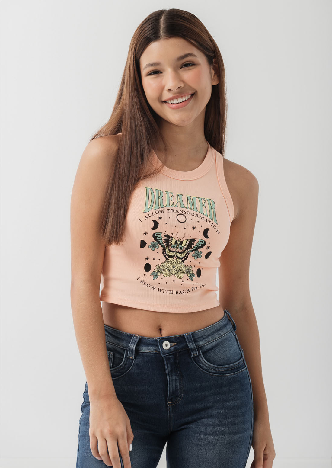 Camiseta manga sisa, color naranja claro y estampado en frente para adolescentes.