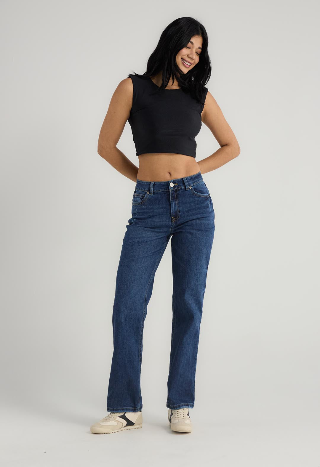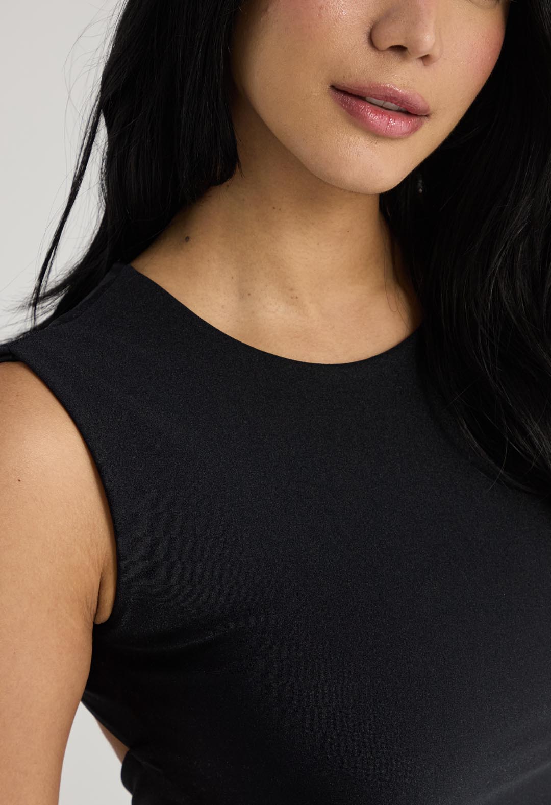 Camiseta manga sisa, color negro, con escote espalda y fondo entero para mujer.