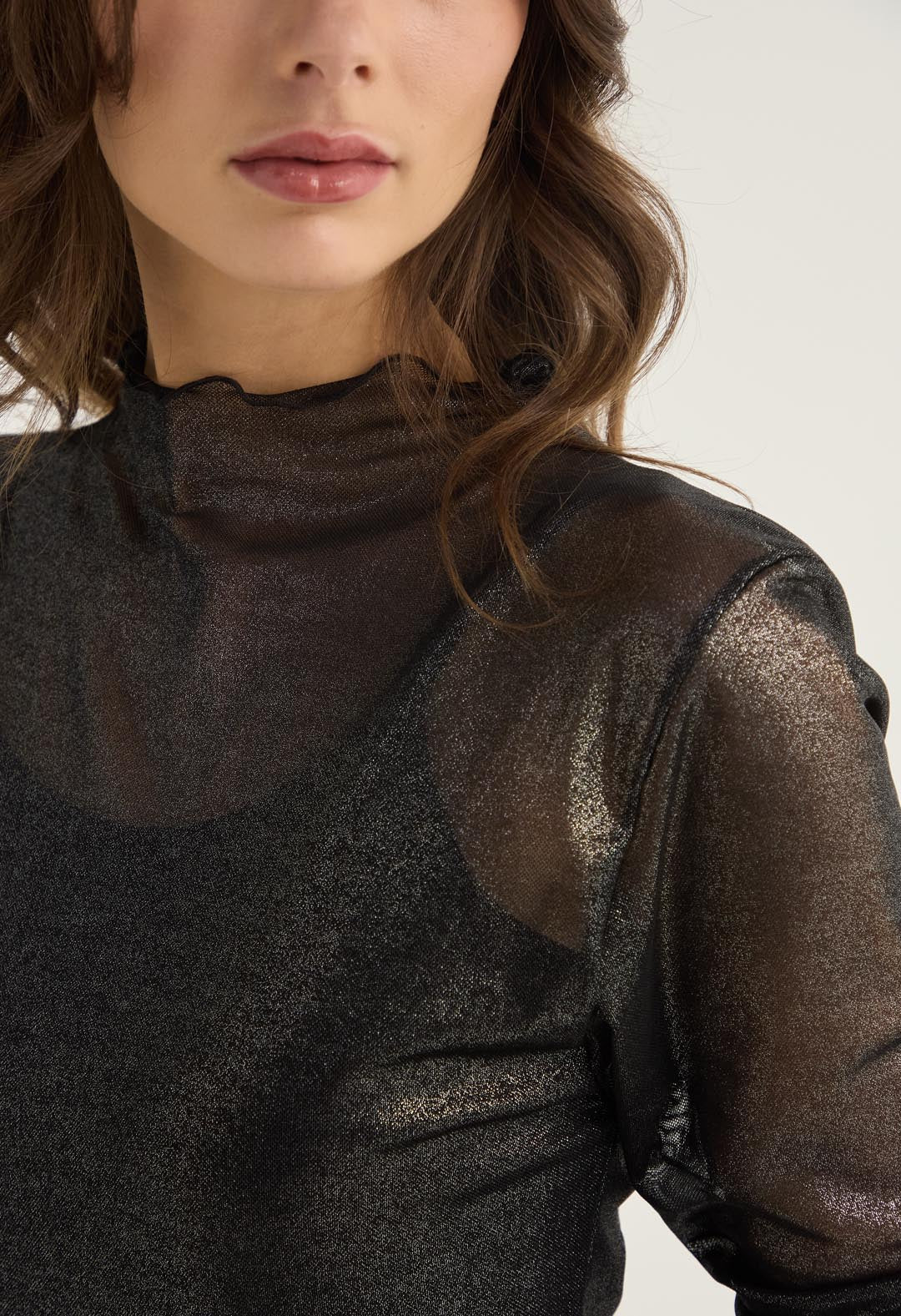 Camiseta manga larga, color negro, tela brillante y top interno para mujer.