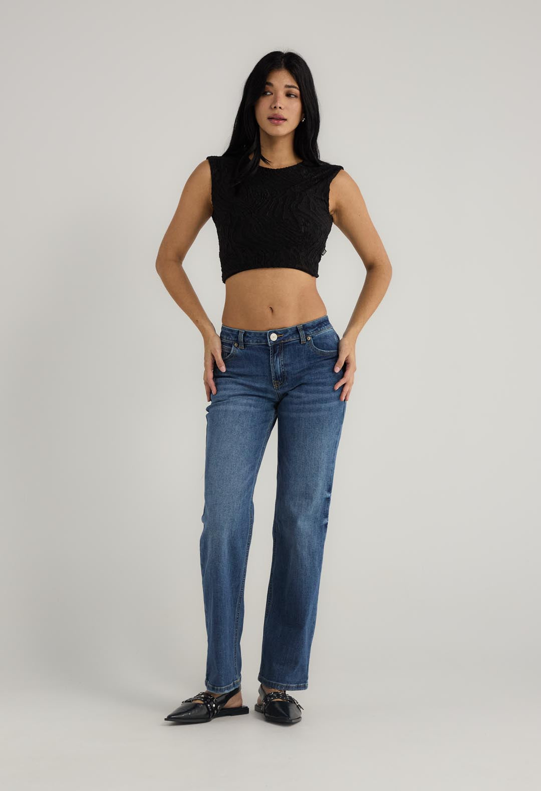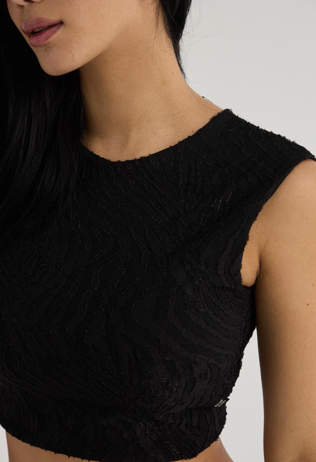 Camiseta manga sisa, color negro, cuello redondo y largo crop para mujer