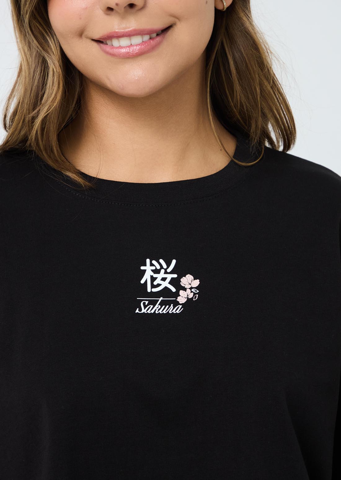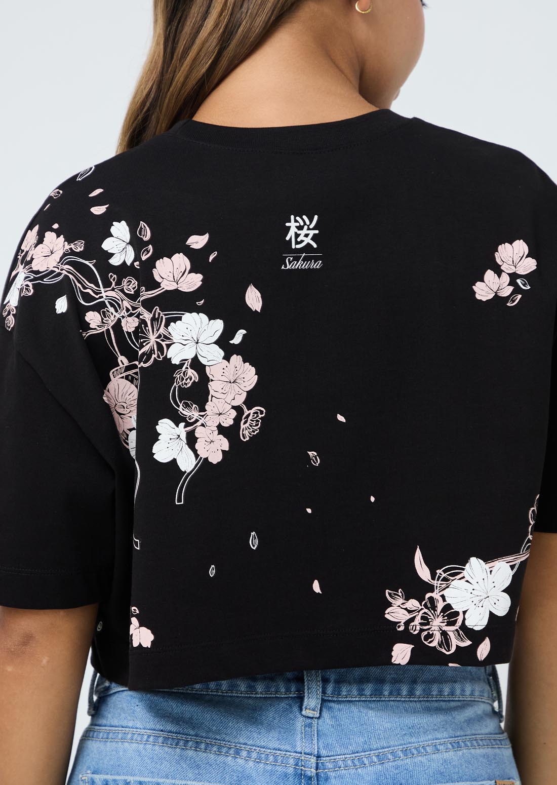 Camiseta manga corta, color negro, largo crop, estampado en frente y espalda para jóvenes.