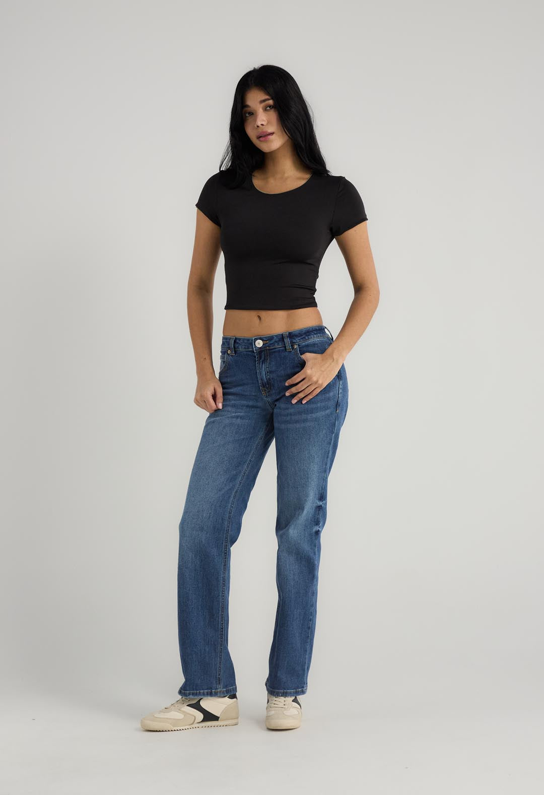 Camiseta manga corta, color negro, largo crop, doble faz y fondo entero para mujer.