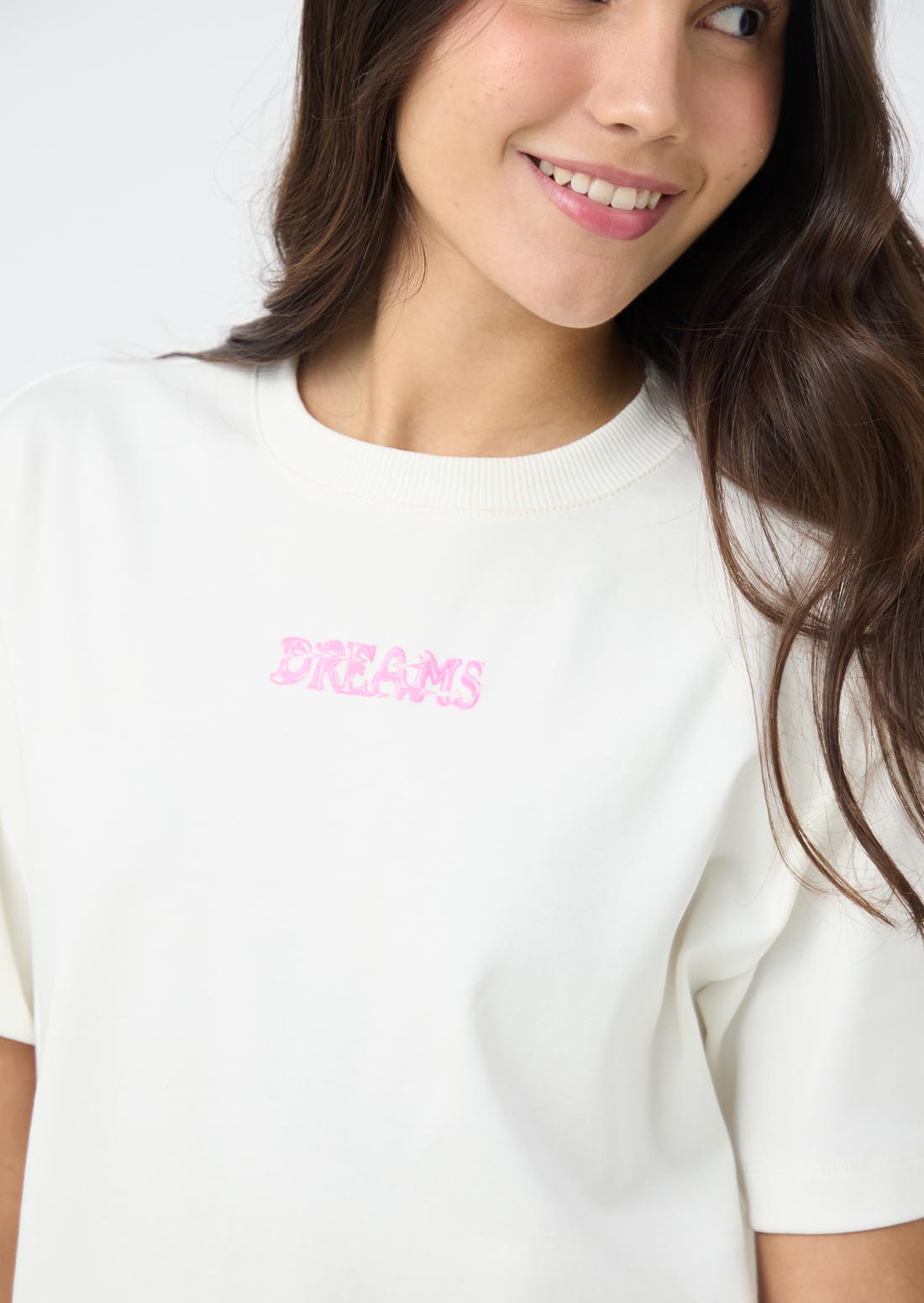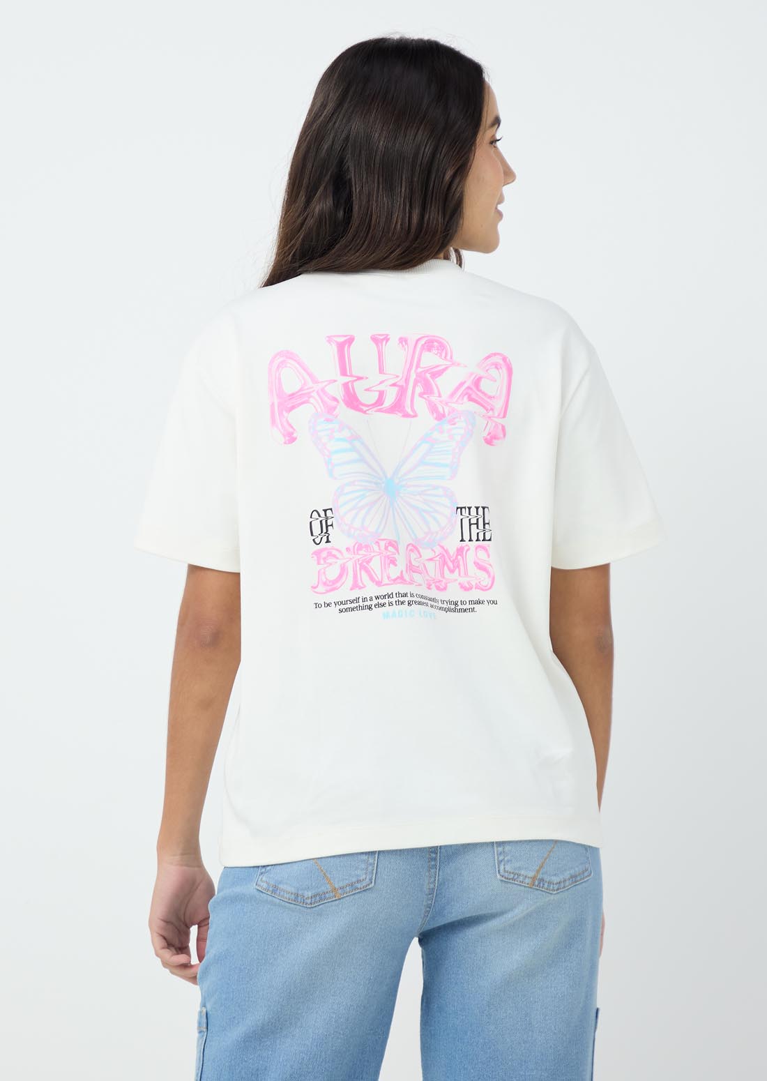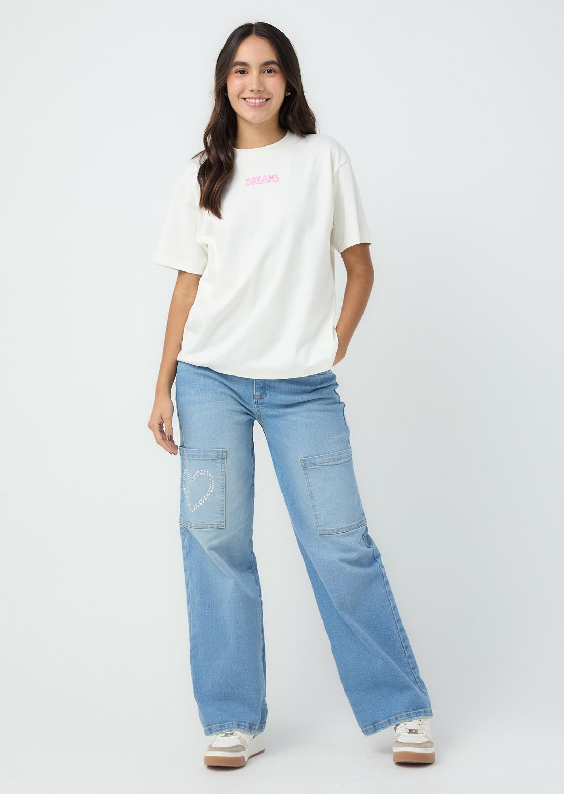 Camiseta manga corta, oversize, color marfil, cuello redondo, estampado en frente y espalda para jóvenes.