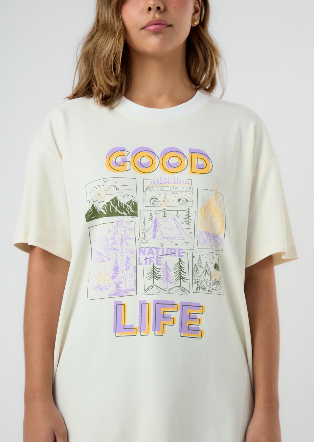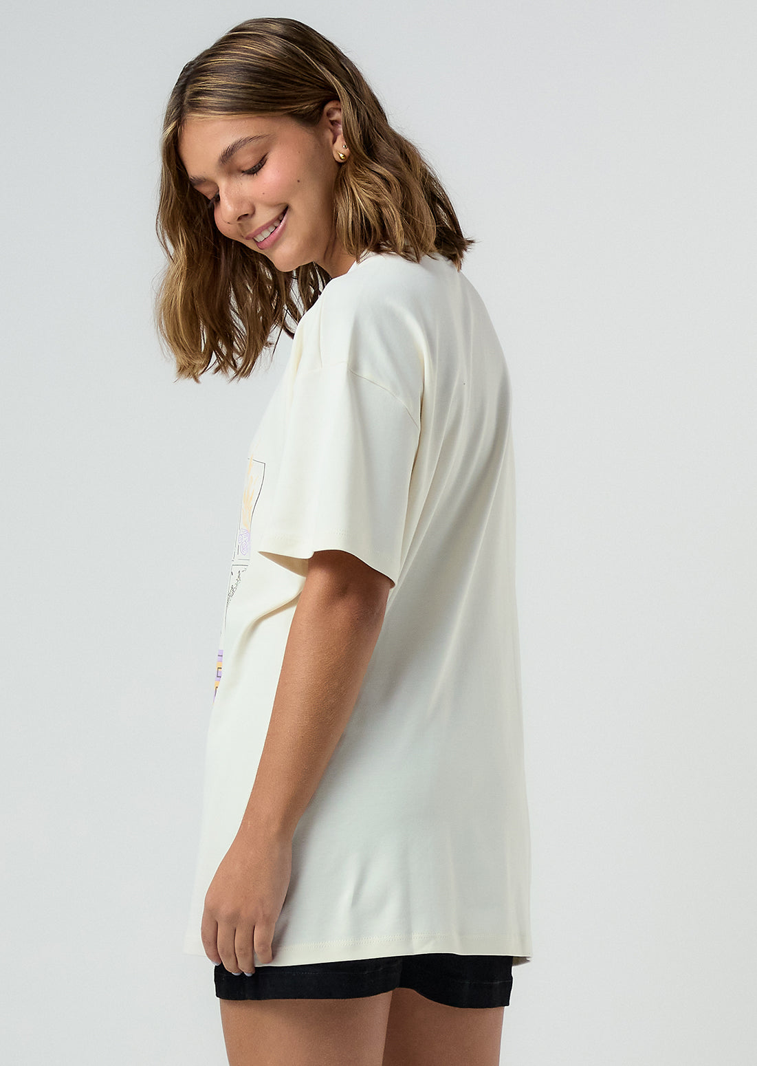 Camiseta oversize, manga corta, color marfil, estampado en frente para adolescentes.
