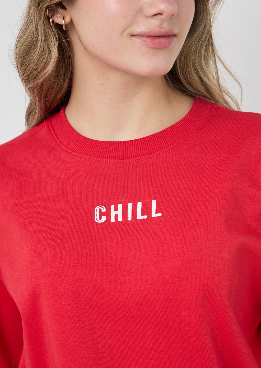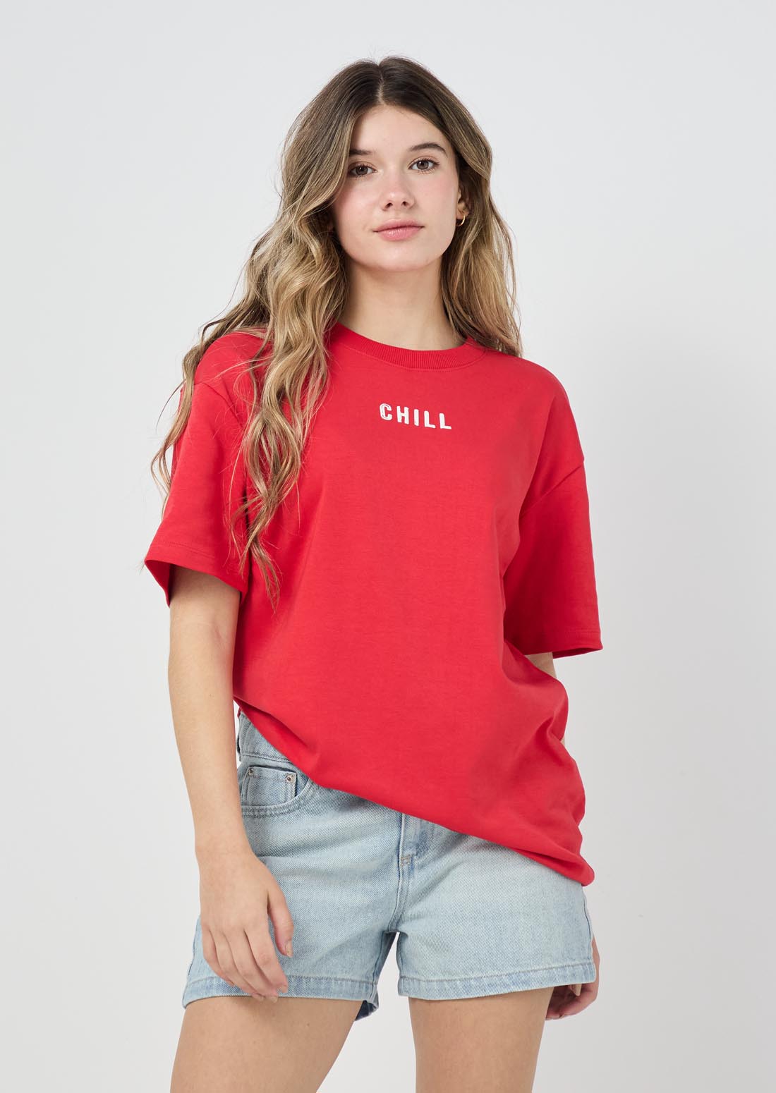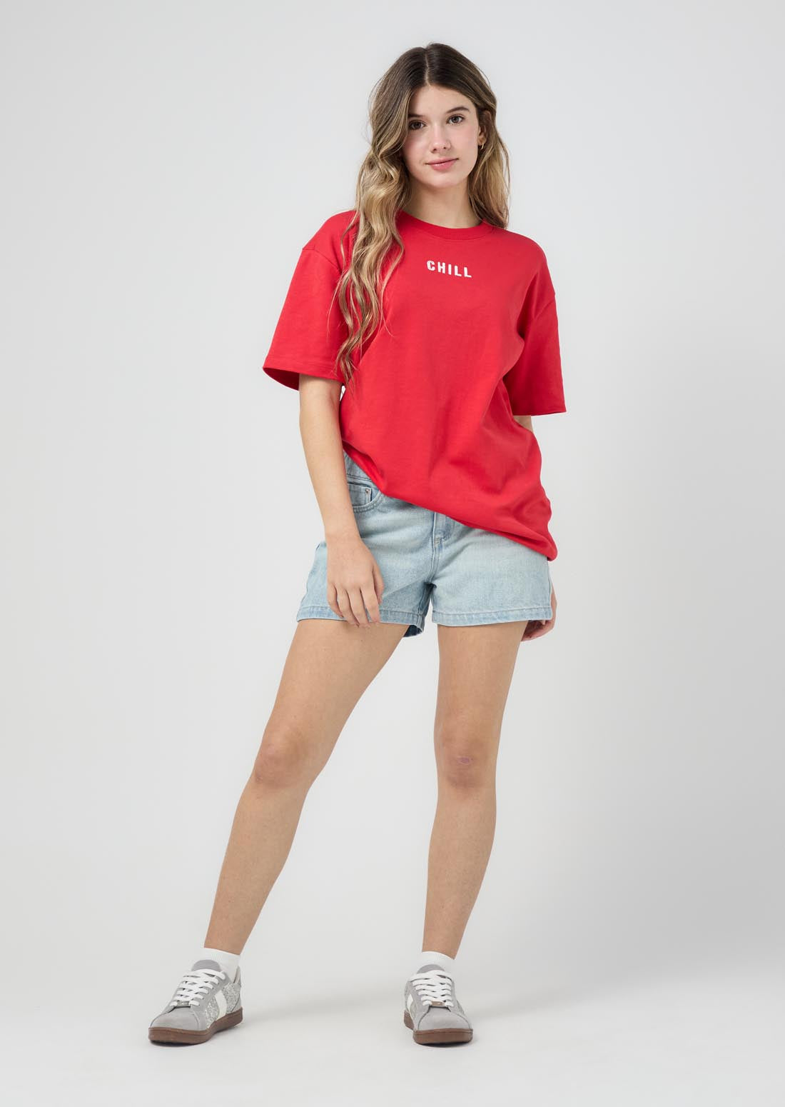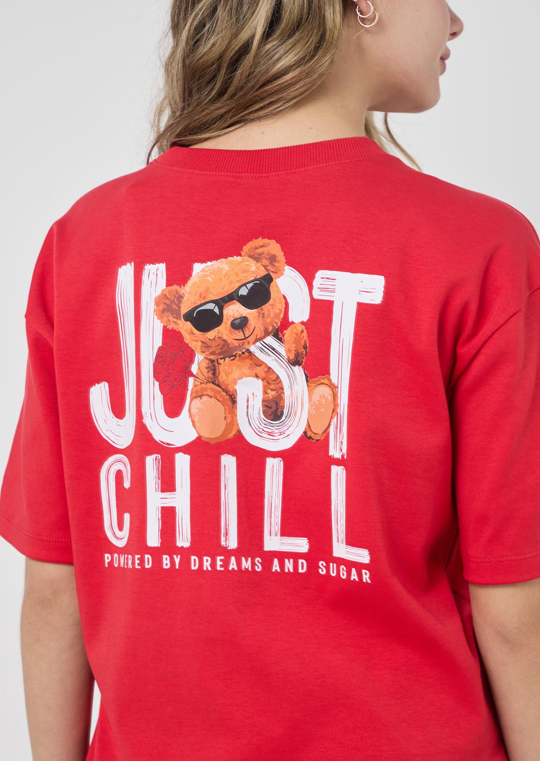 Camiseta manga corta, color rojo, estampada y oversize para jóvenes.