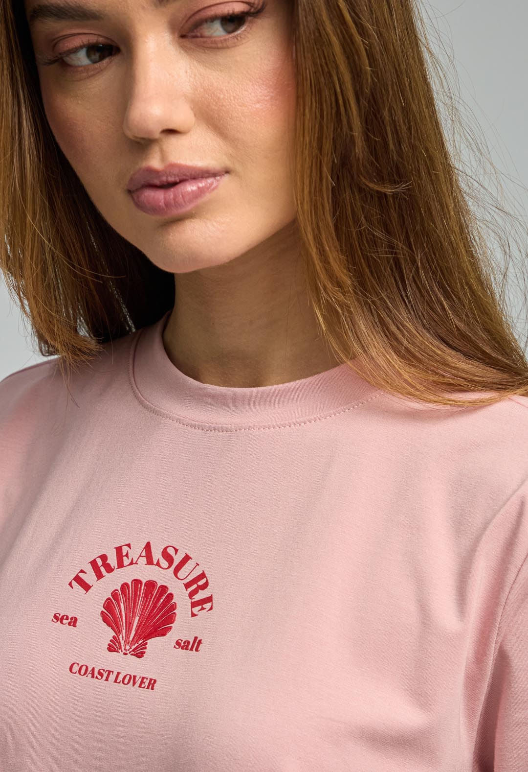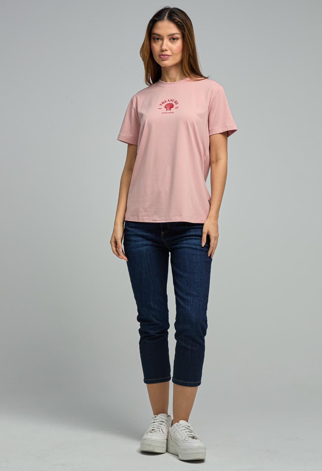 Camiseta manga corta, color palo de rosa y frente estampado para mujeres.
