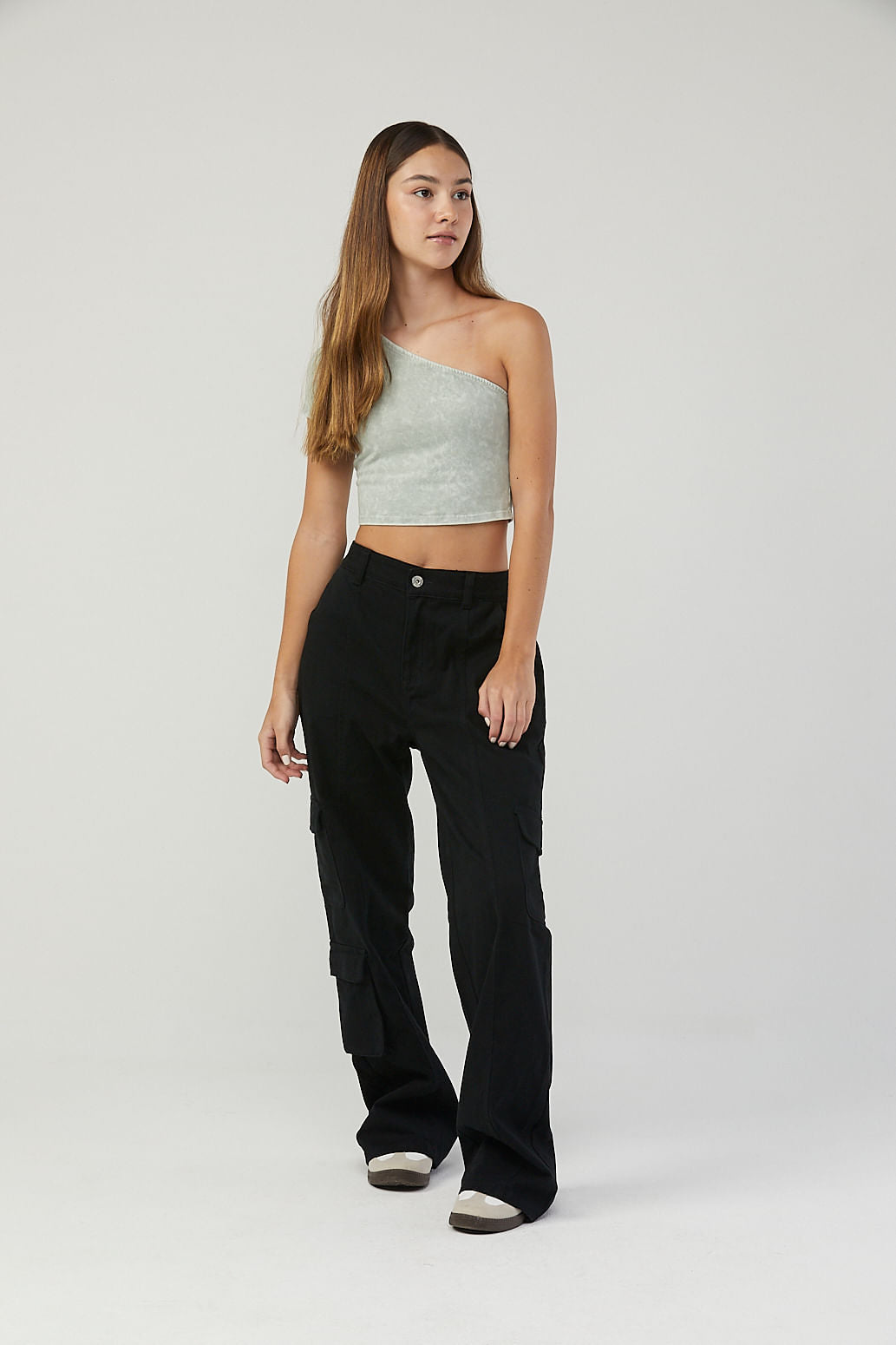 Camiseta manga corta, color pistacho y con hombro descubierto para jóvenes.