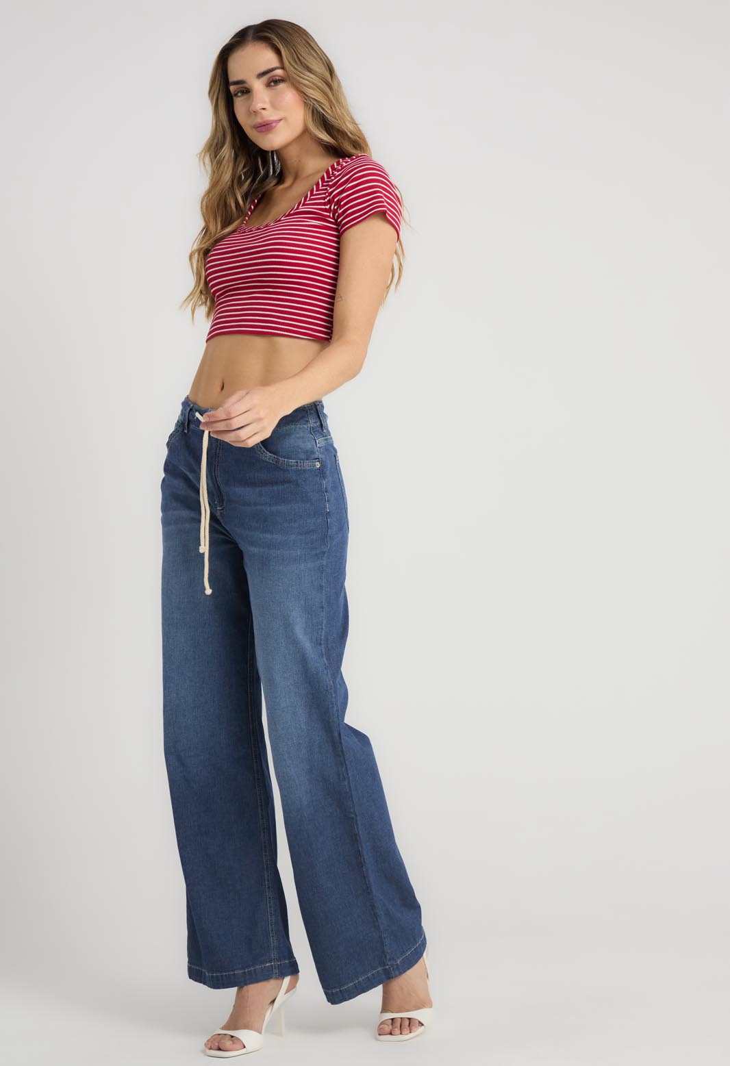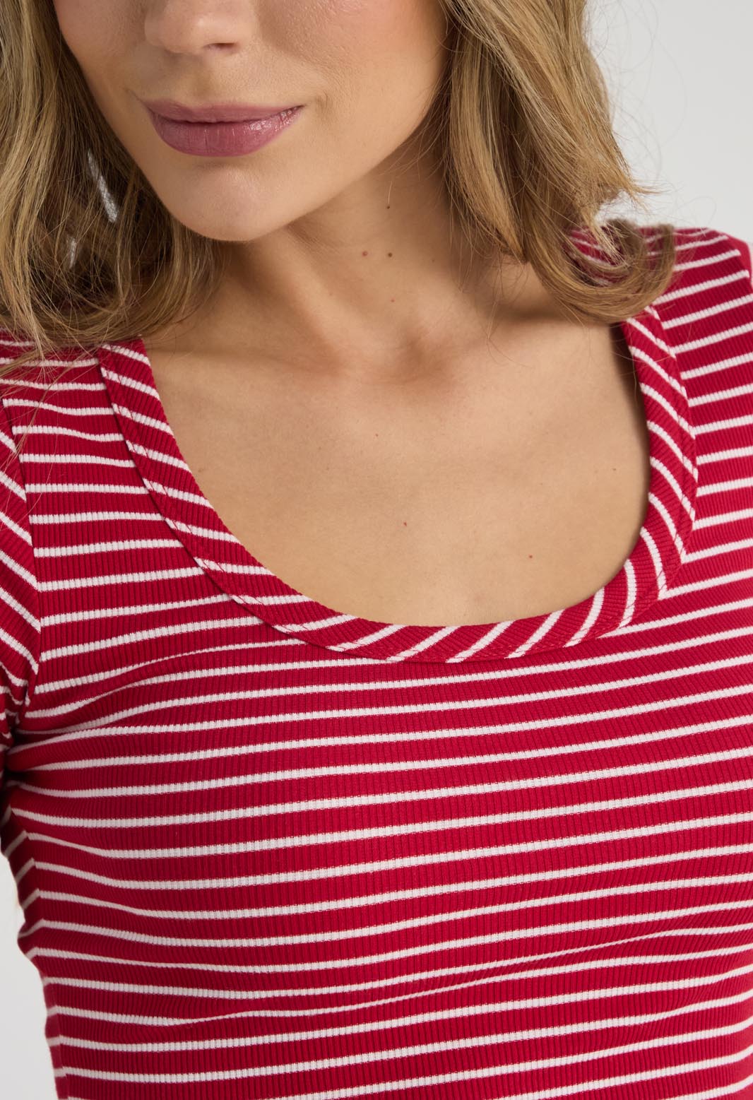 Camiseta a rayas, manga corta, color rojo y largo crop para mujeres.