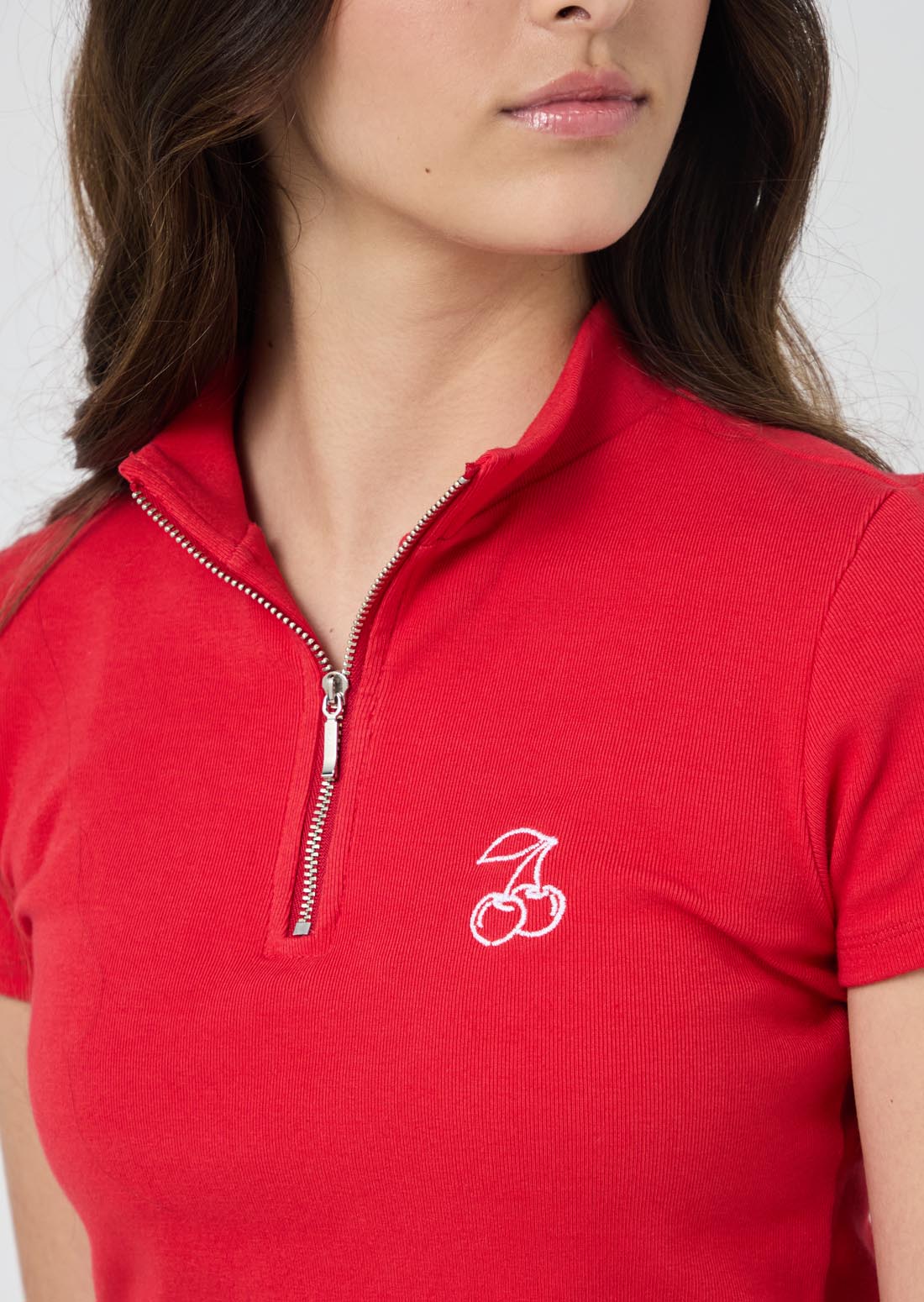 Camiseta manga corta,color rojo, cuello redondo y con cierre en escote para jóvenes.
