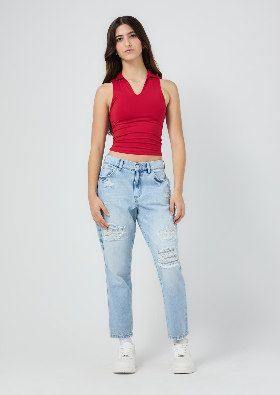 Camiseta manga sisa, color rojo, escote en v y fondo entero para jóvenes.