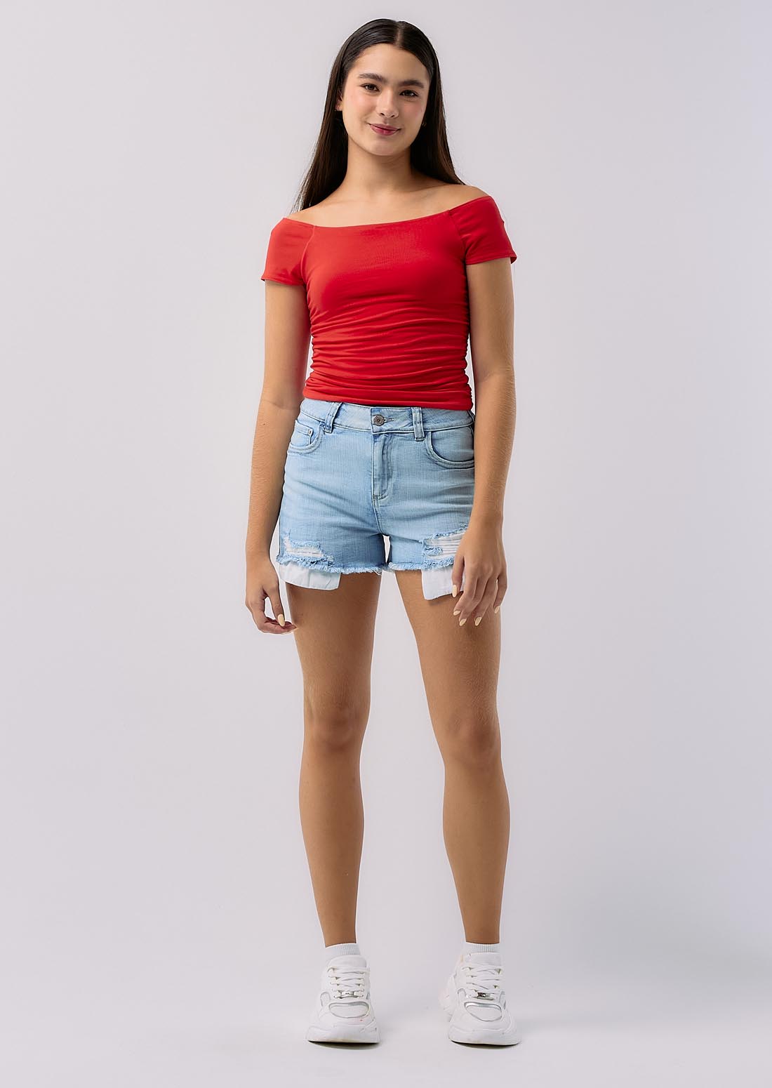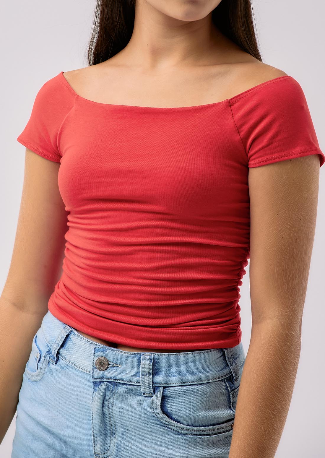 Camiseta manga corta, color rojo, cuello bandeja y recogido en costados para jóvenes.