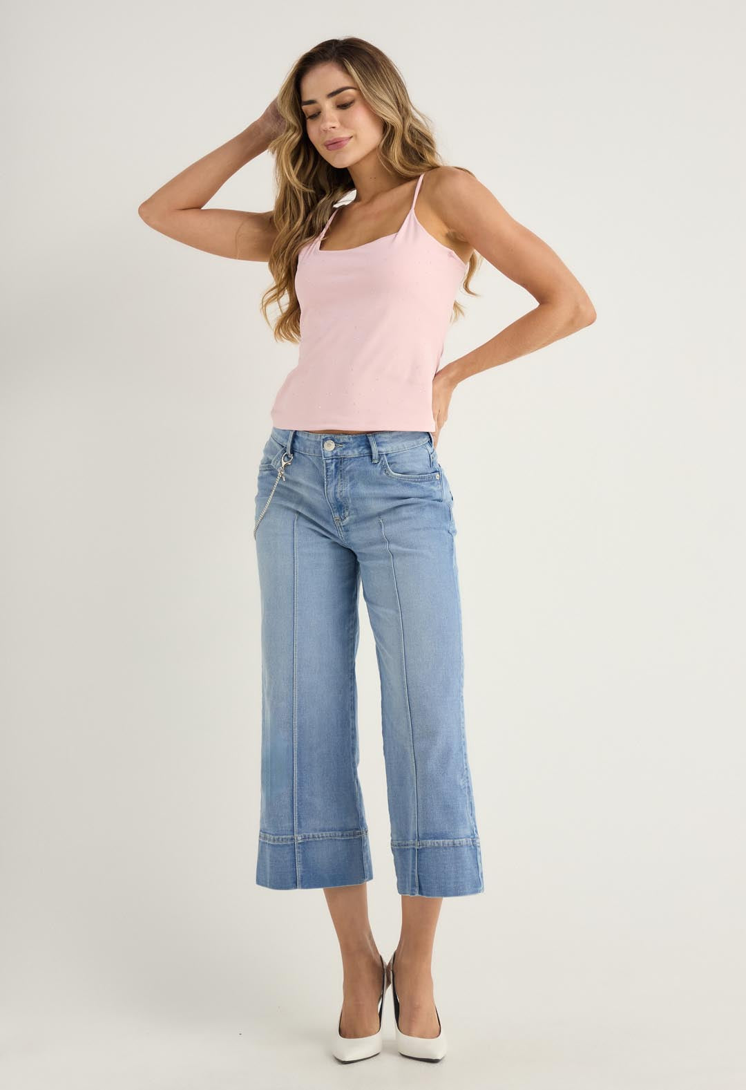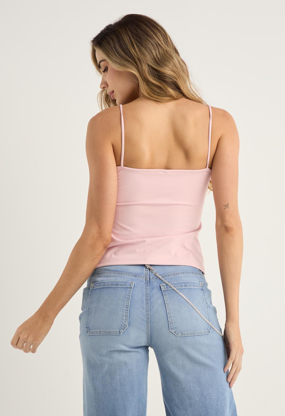 Camiseta de tiras, color rosa claro, escote redondo y brillos para mujer.