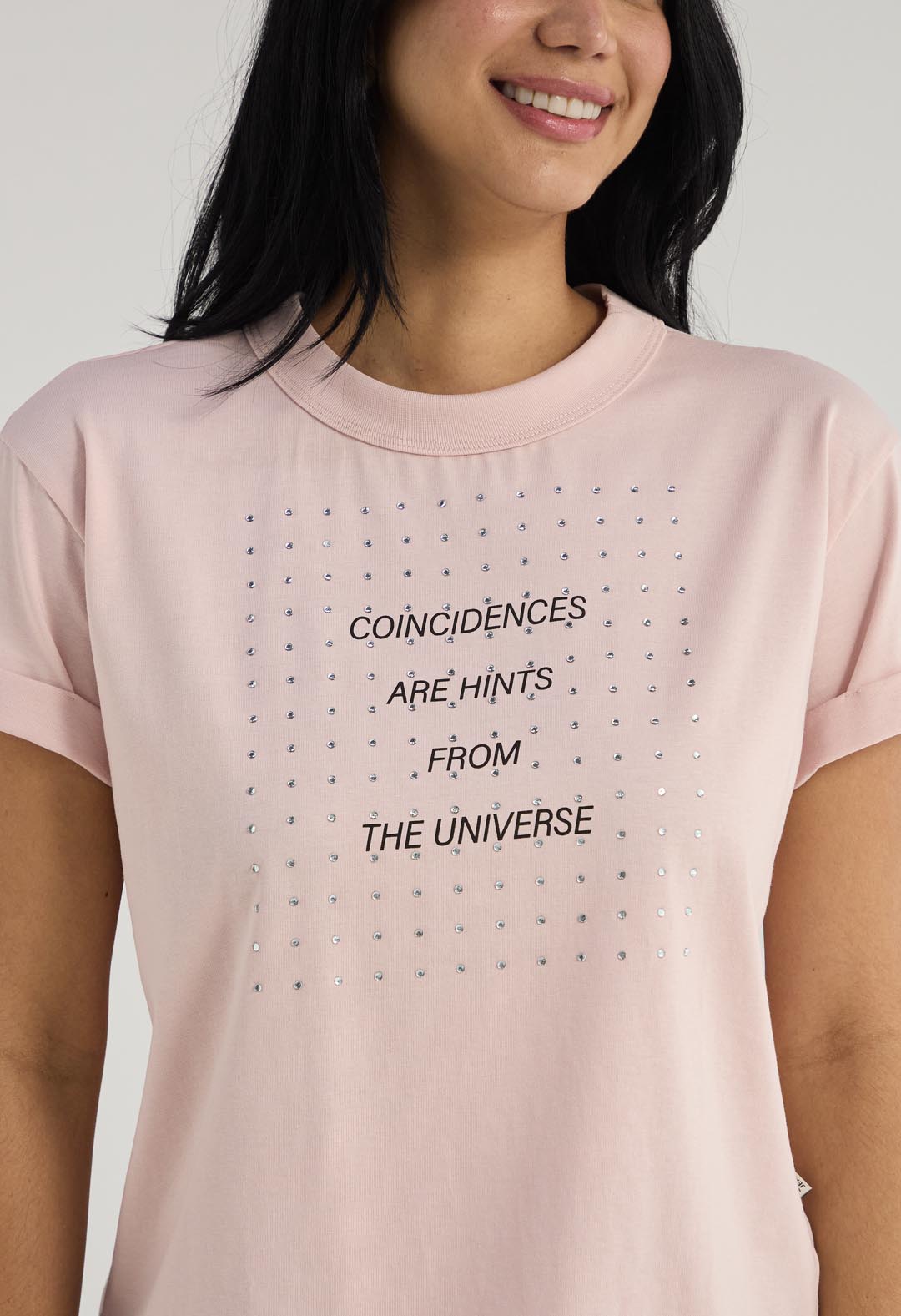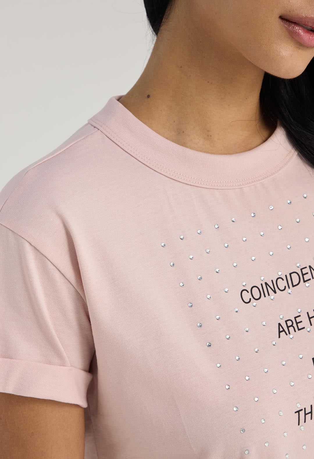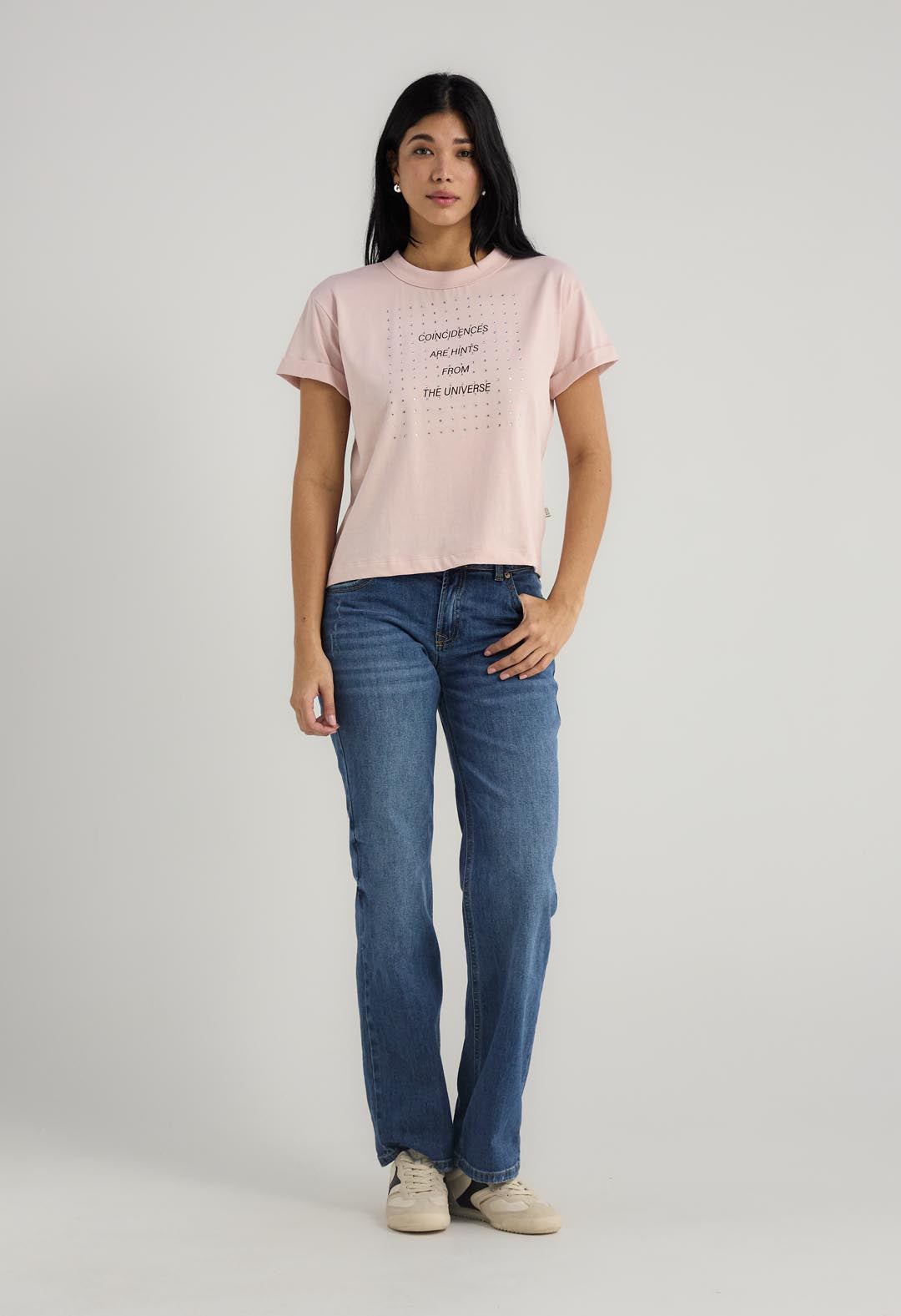 Camiseta manga corta, color rosa claro, con guardapolvo, cuello redondo y estampado en frente para mujer.