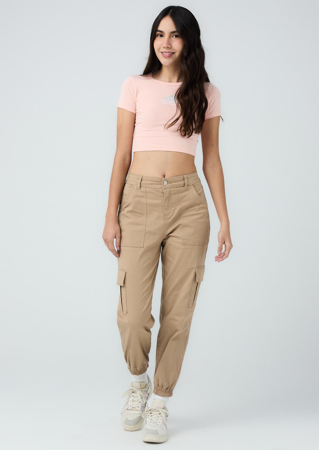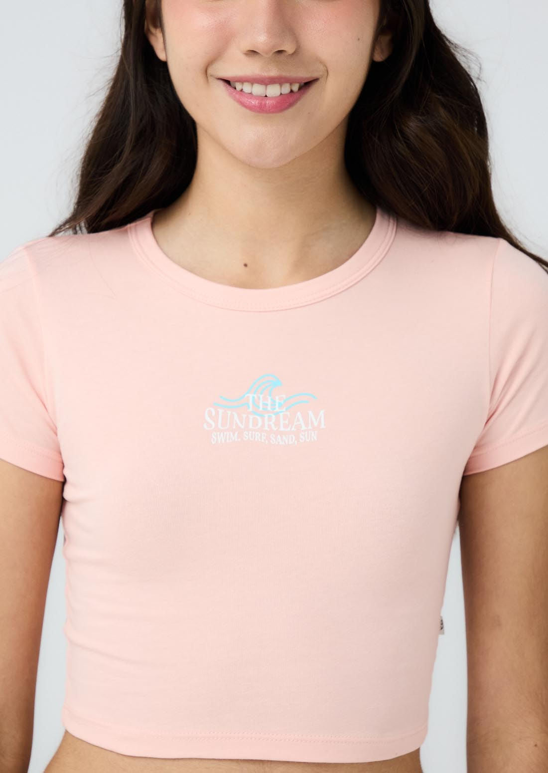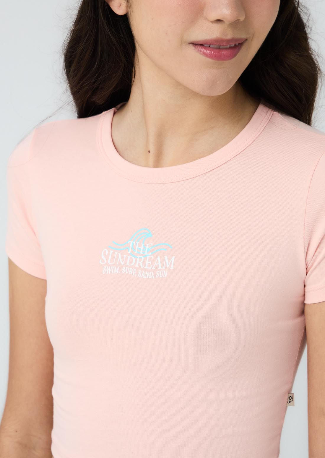 Camiseta manga corta, color rosa claro y estampado en frente para jóvenes.