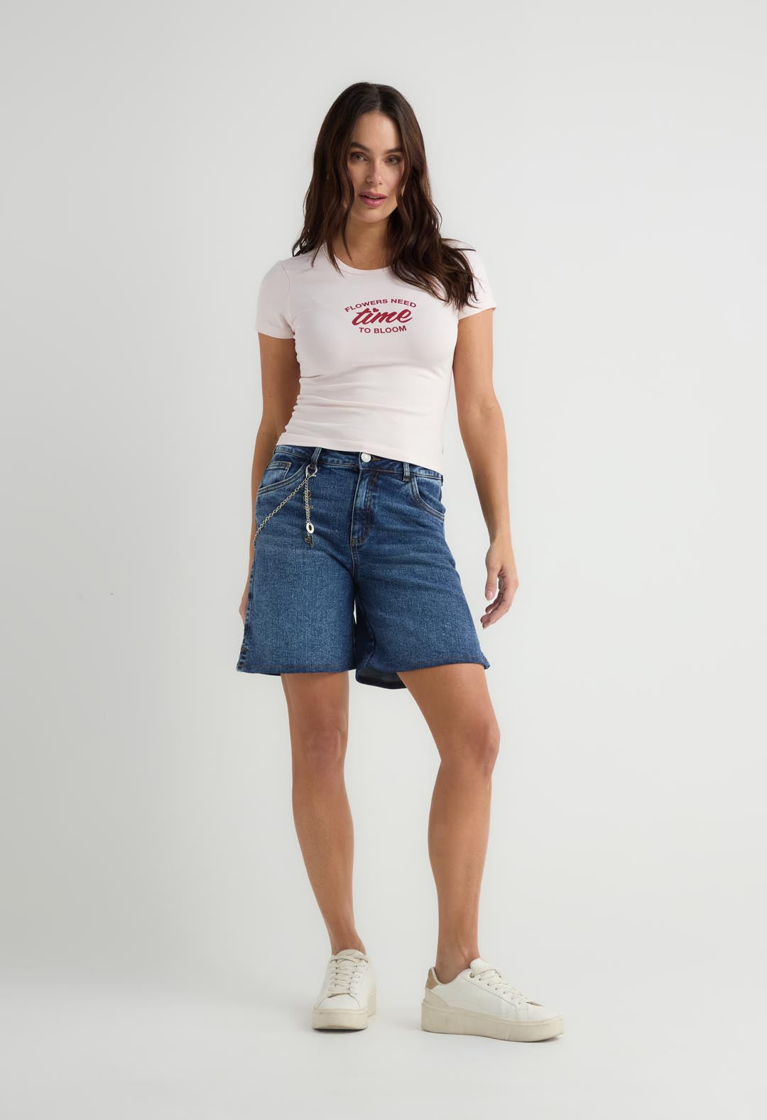 Camiseta manga corta, color rosa claro, largo hasta pretina, cuello redondo y estampado en frente para mujer.