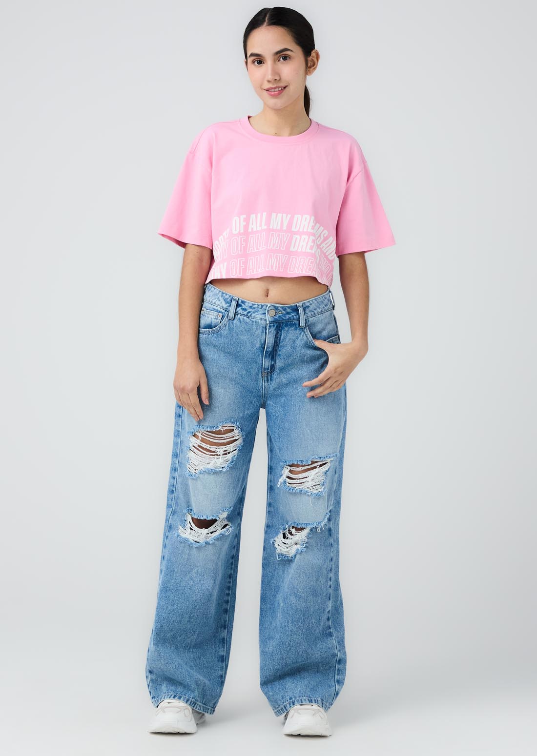 Camiseta rosa medio estampada en ruedo para jóvenes