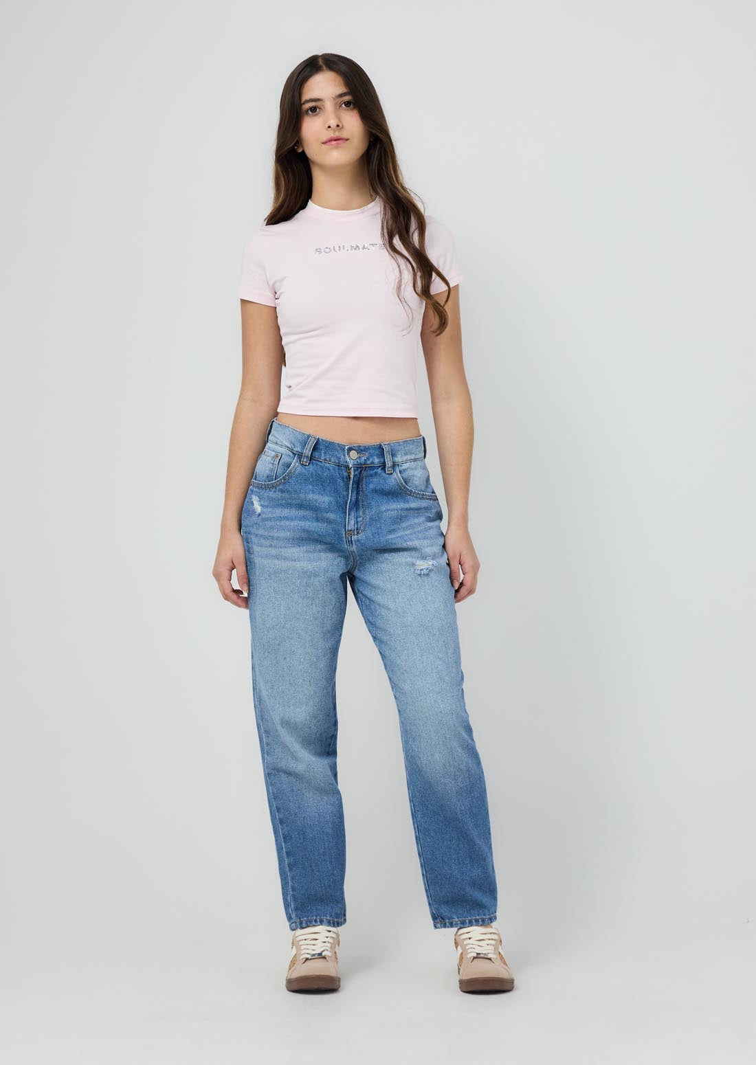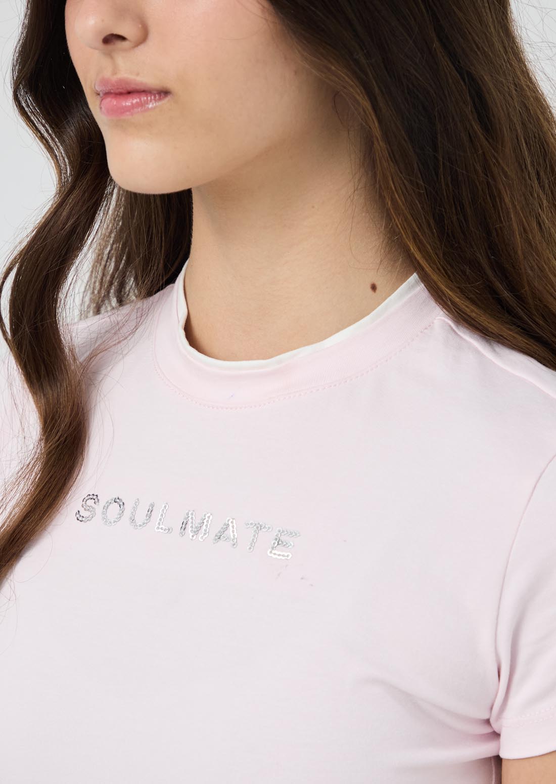 Camiseta manga corta, color rosa pastel, con estampado en frente y cuello en contraste para jóvenes.