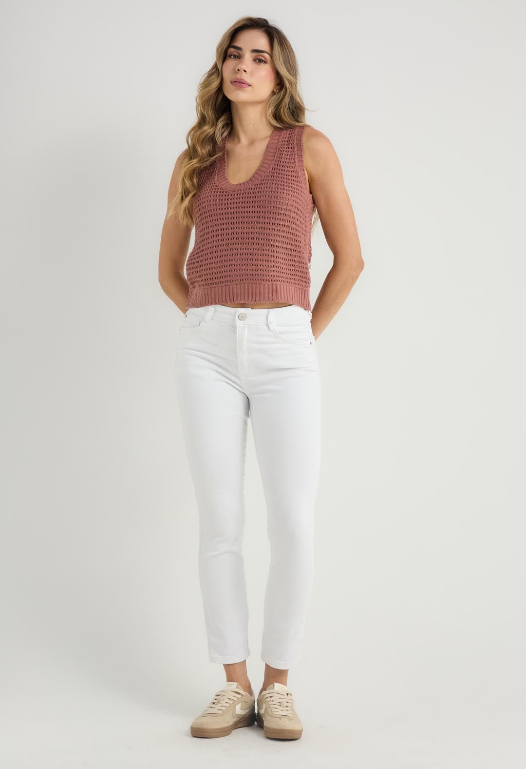 Camiseta tejida, manga sisa, color rosa viejo, escote profundo y fondo entero para mujeres.