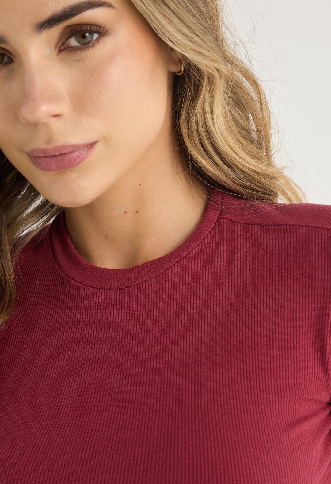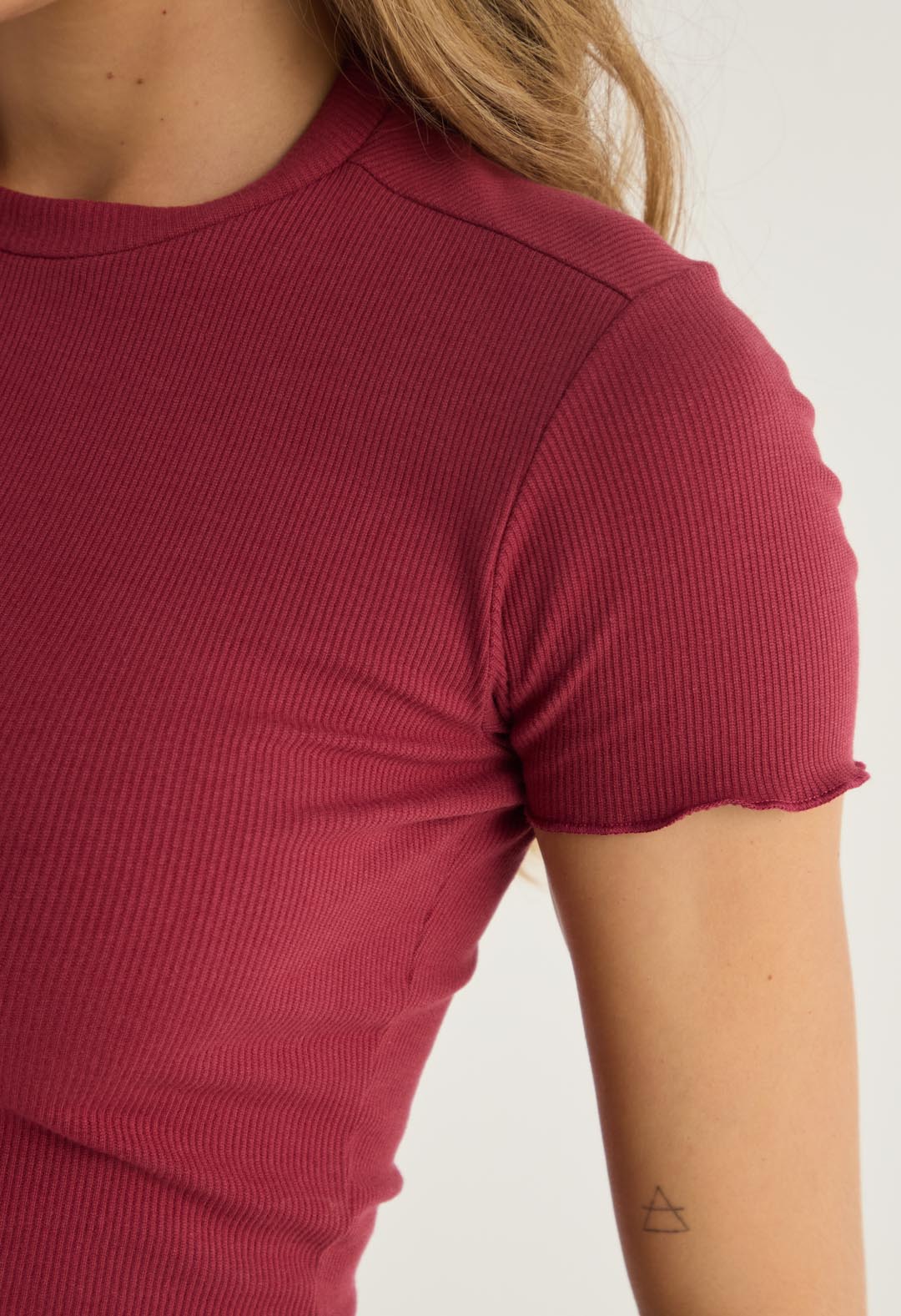 Camiseta manga corta con mini ruche en ruedo, color terracota, fondo entero y cuello redondo para mujeres.