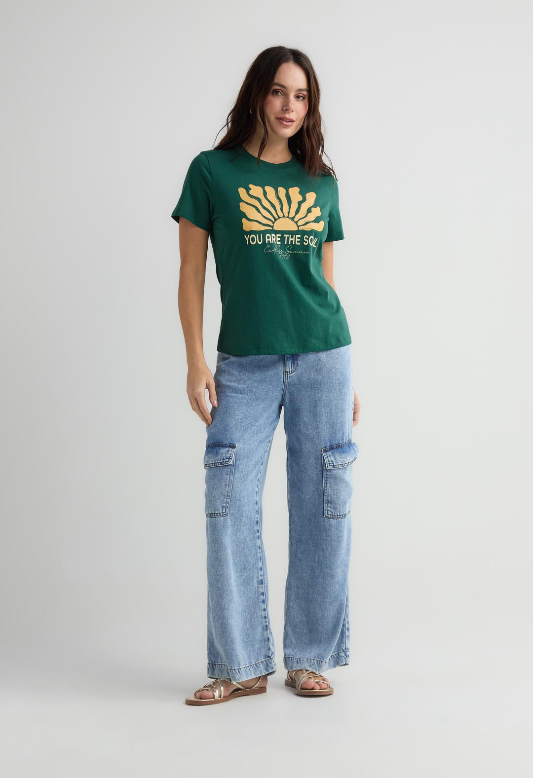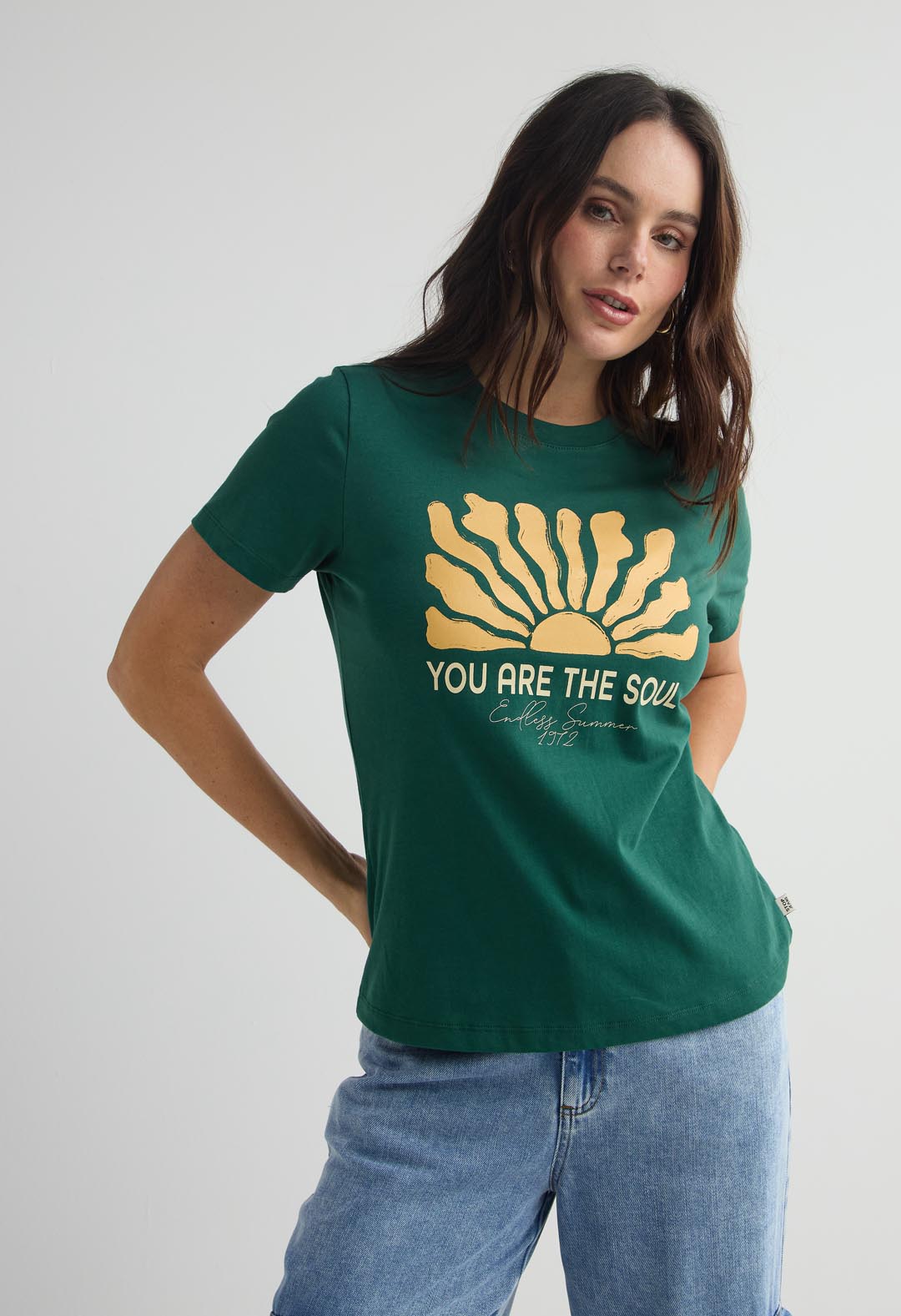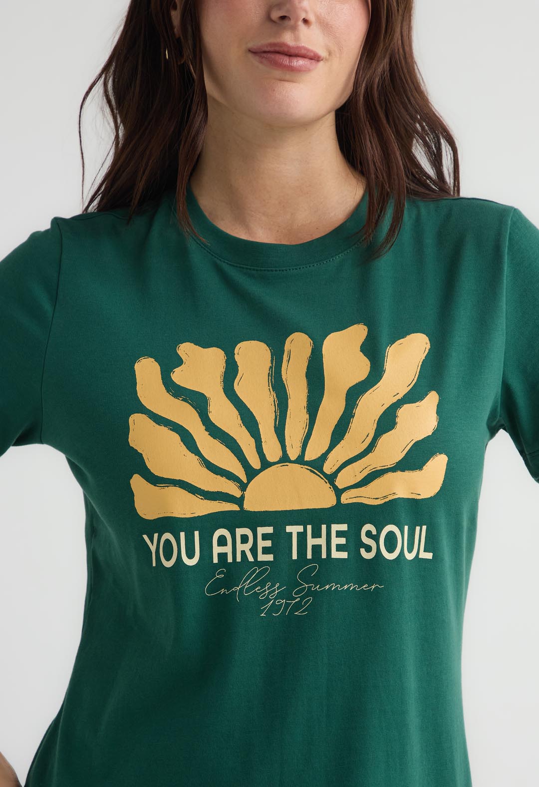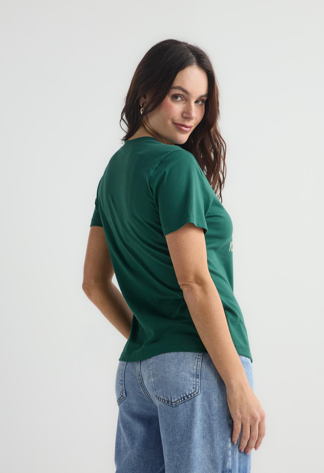 Camiseta de manga corta, color verde botella, con estampado en frente y cuello redondo para mujer.