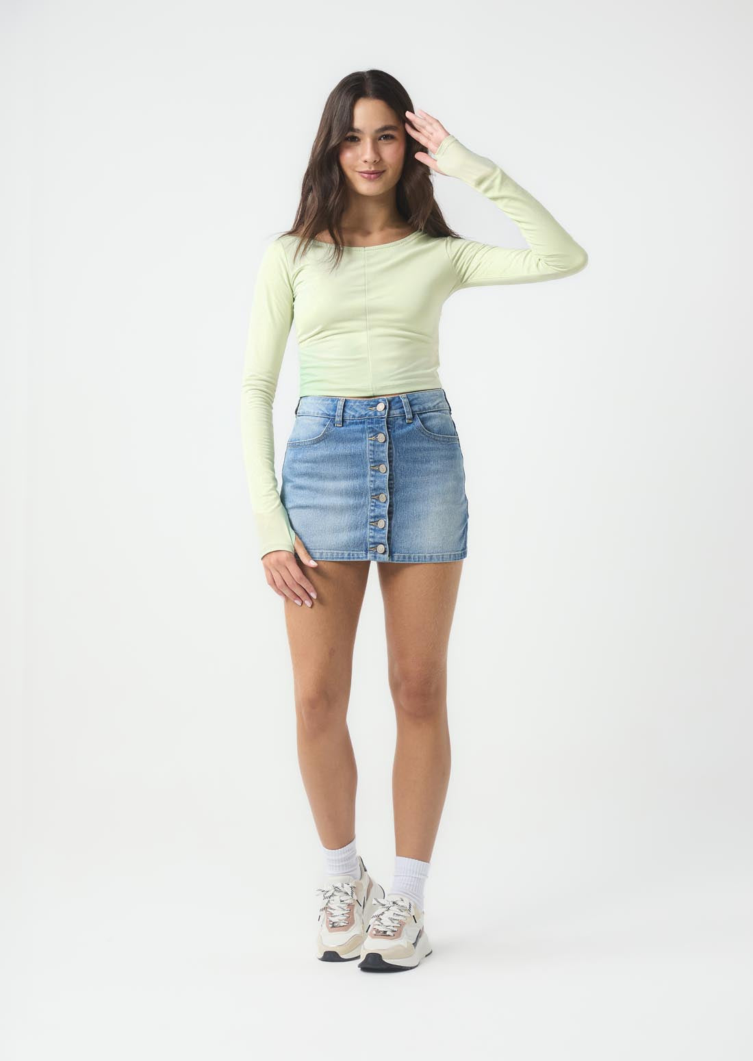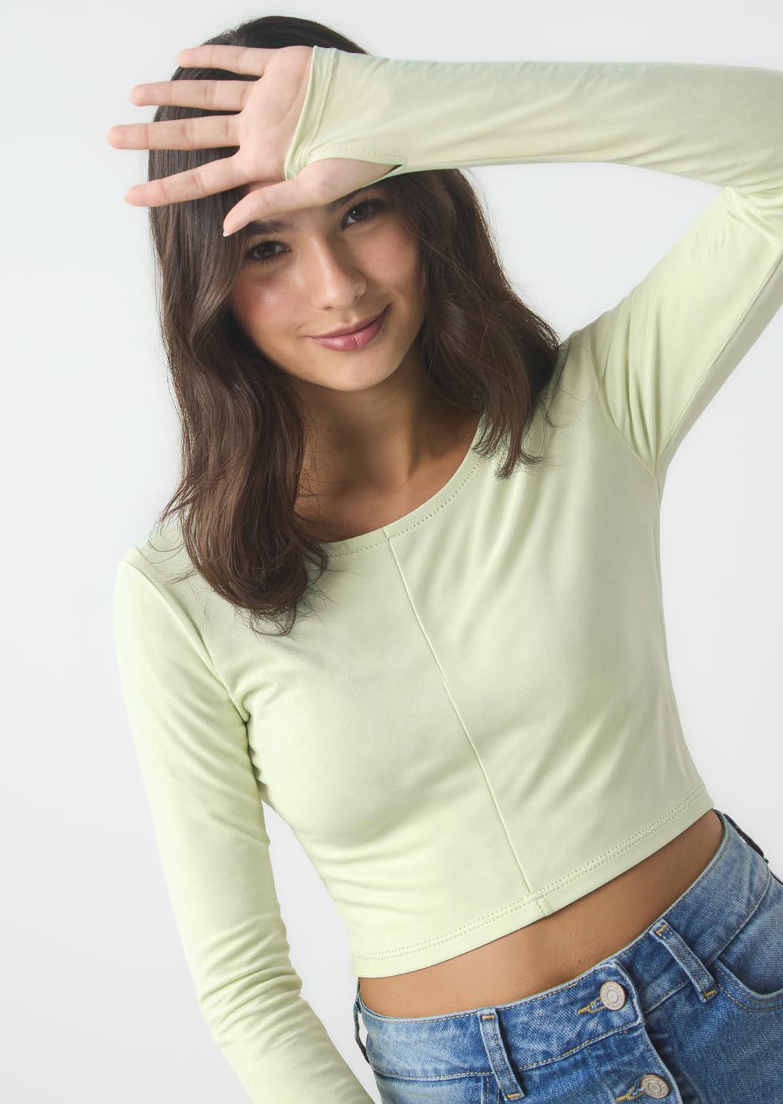 Camiseta de manga larga, color verde claro, con corte en centro, abertura para dedo y fondo entero para jóvenes.