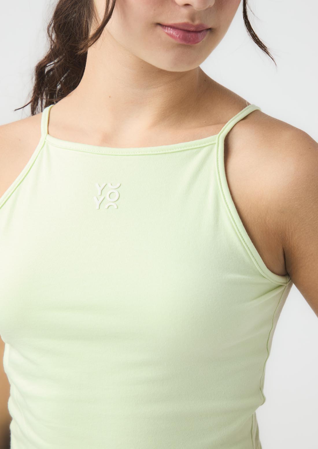 Camiseta de manga sisa, color verde claro, fondo entero, cuello alto para jóvenes.