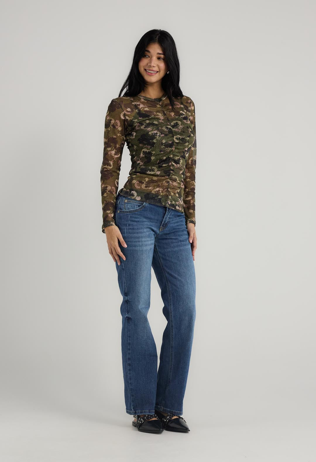 Camiseta manga larga, color verde, en malla con recogido y top interno para mujer.