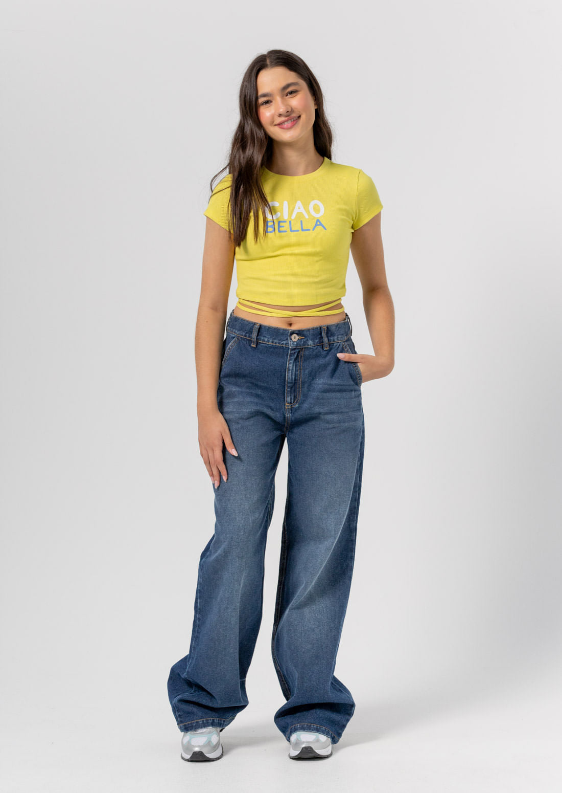 Camiseta manga corta, color verde lima, tiras en cintura para anudar y frente estampado para jóvenes.