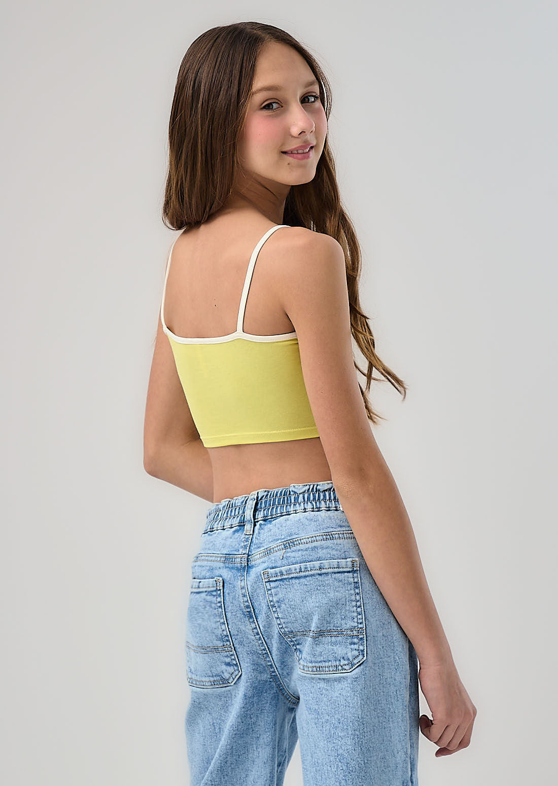 Camiseta de tiras, color verde lima, frente estampado y sesgos en contraste para niñas.