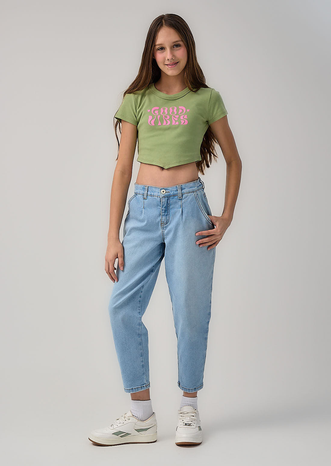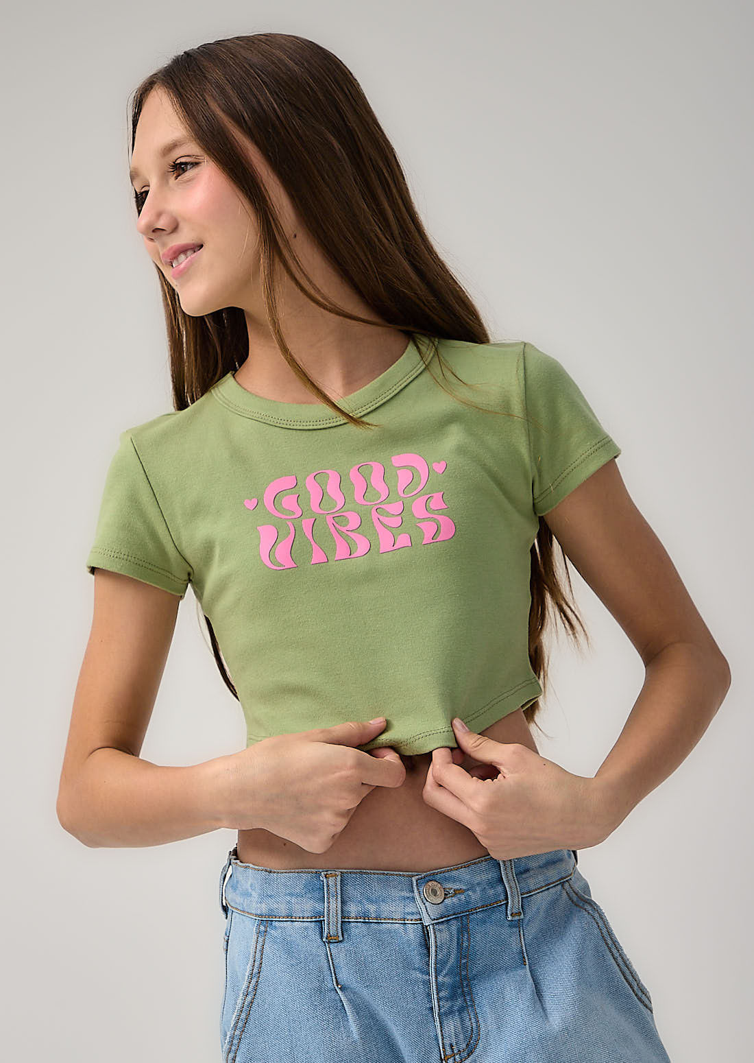 Camiseta manga corta, color verde manzana, estampado y terminada en V para niñas.