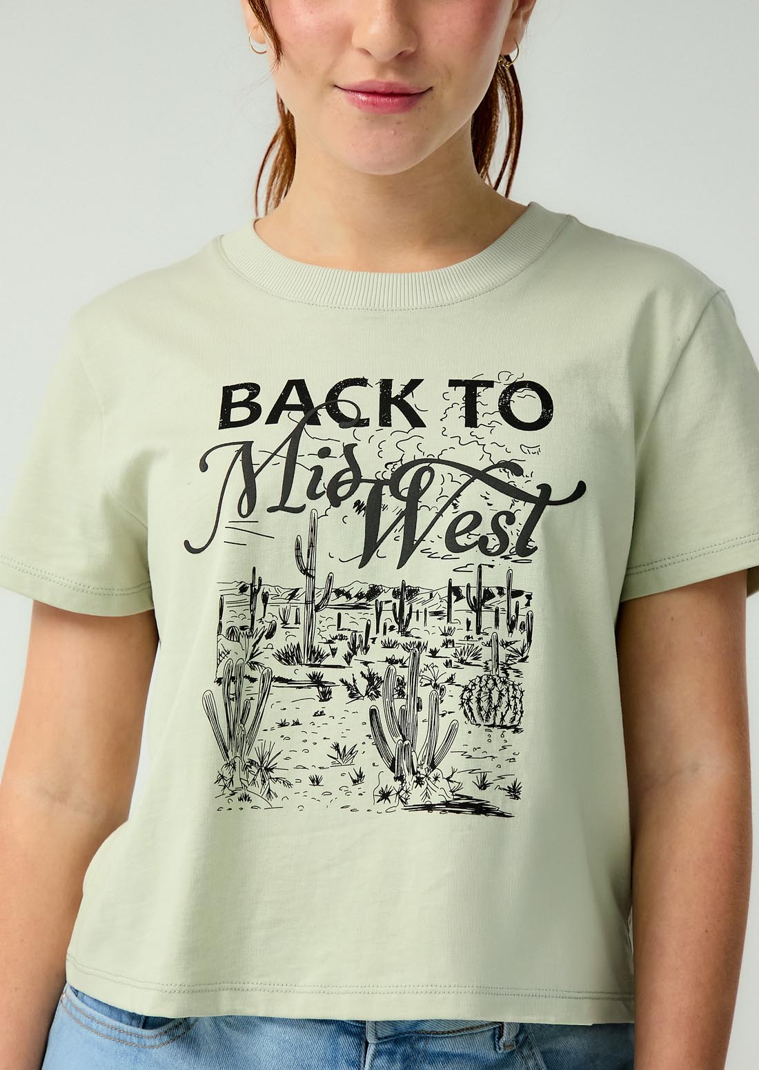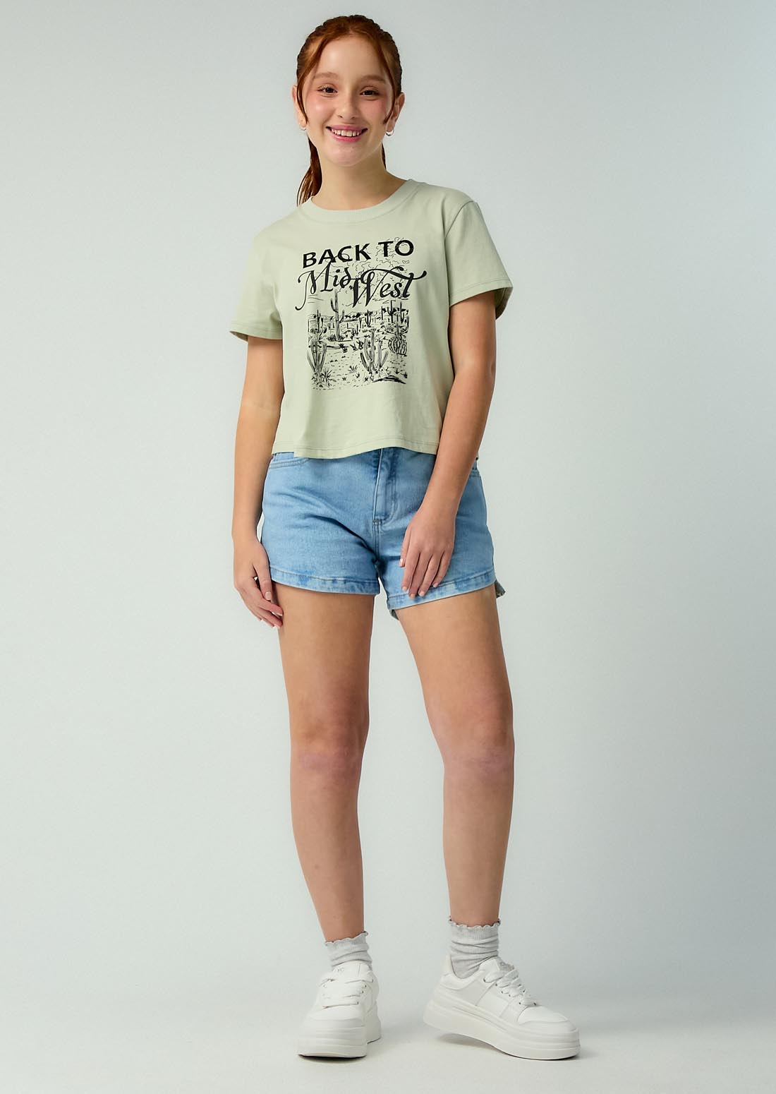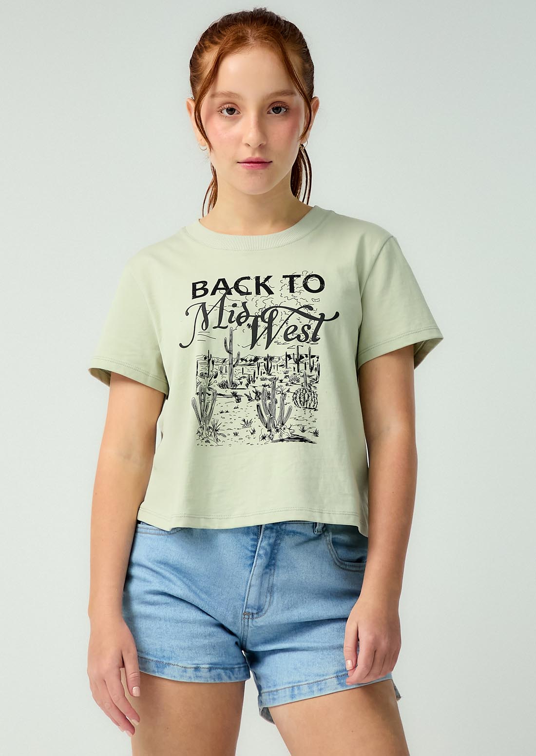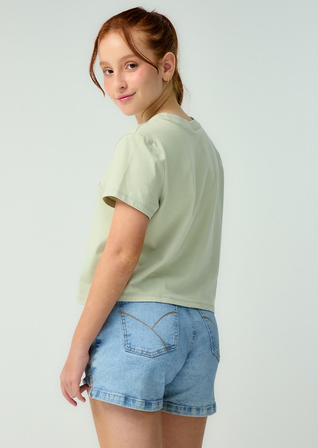 Camiseta manga corta, color verde menta, estampado en frente y cuello redondo para jóvenes.