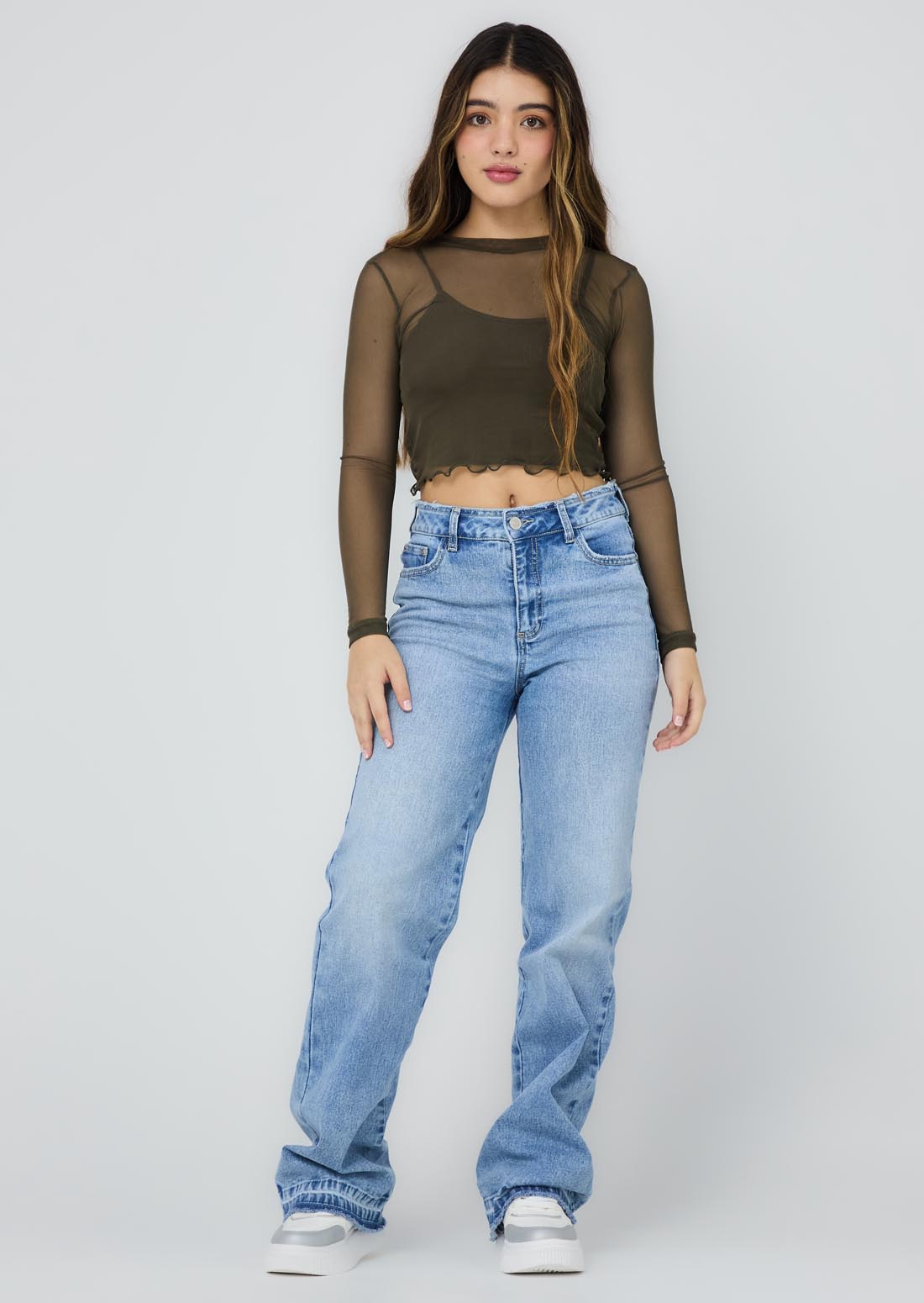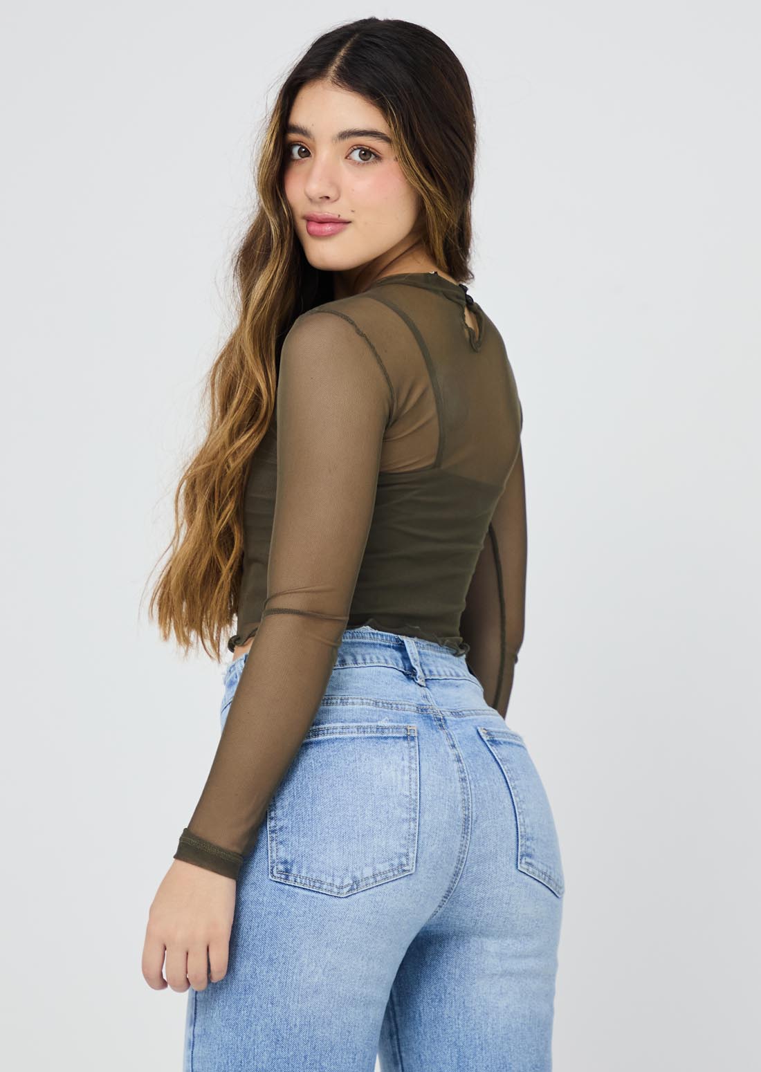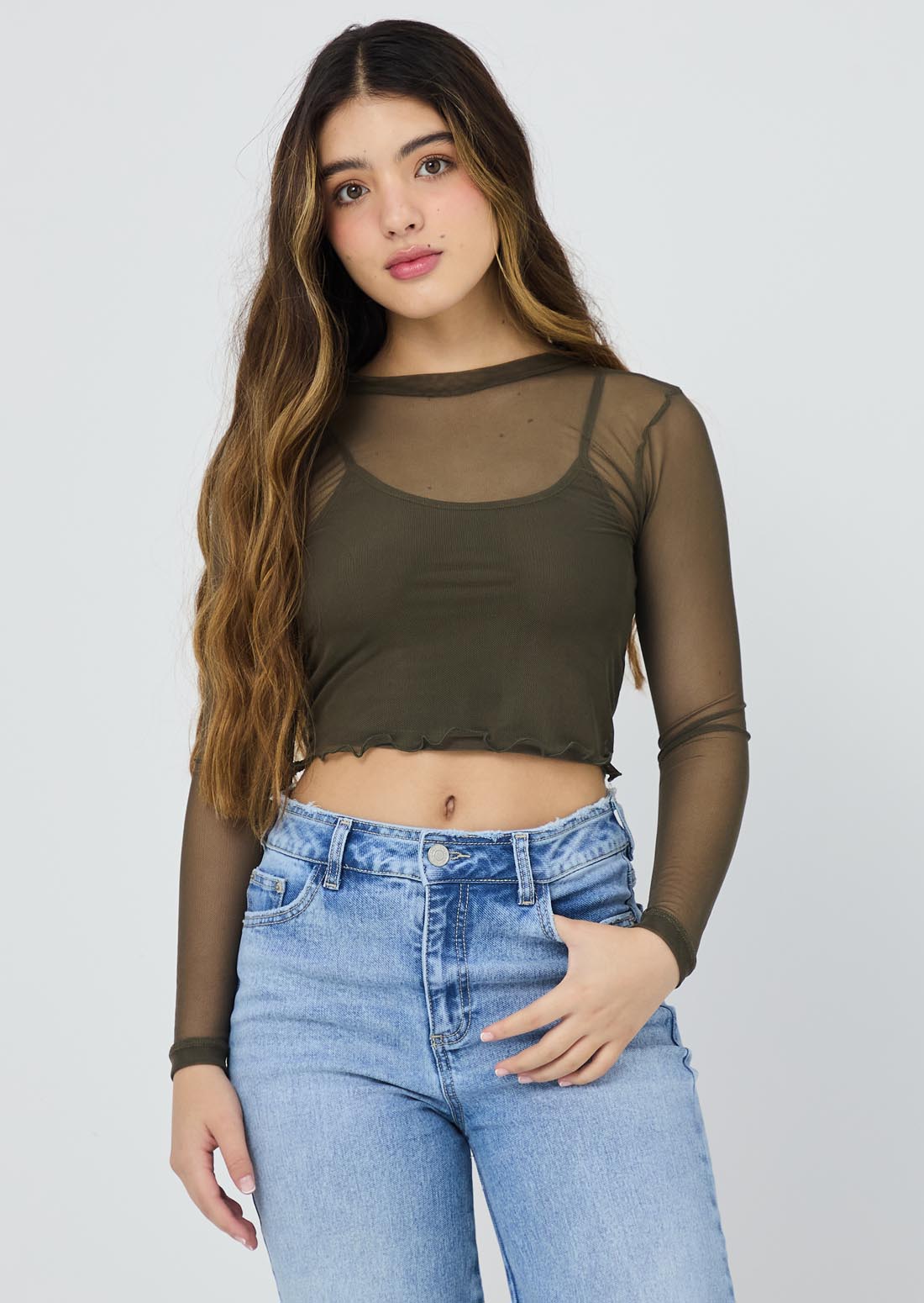 Camiseta manga larga, color verde militar, doble prenda con top interno para jóvenes.