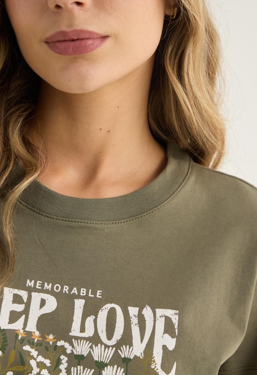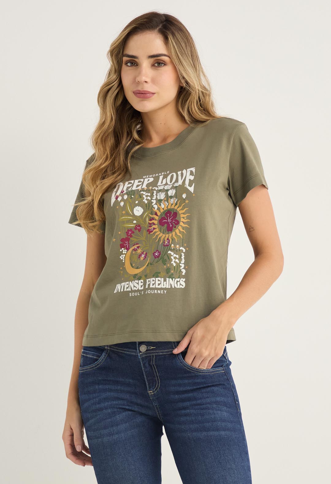 Camiseta manga corta, color verde militar, estampada en frente y cuello redondo para mujer.