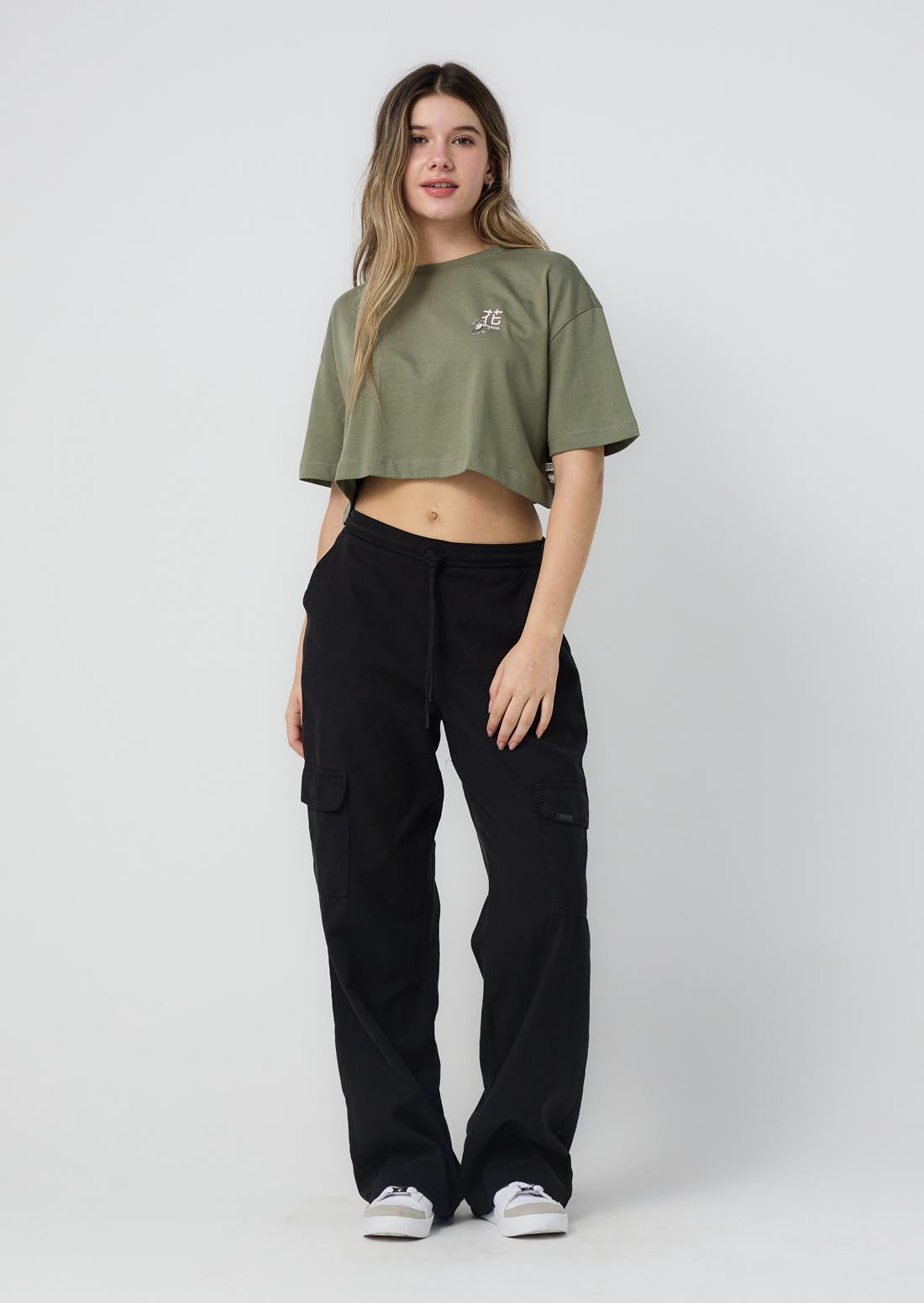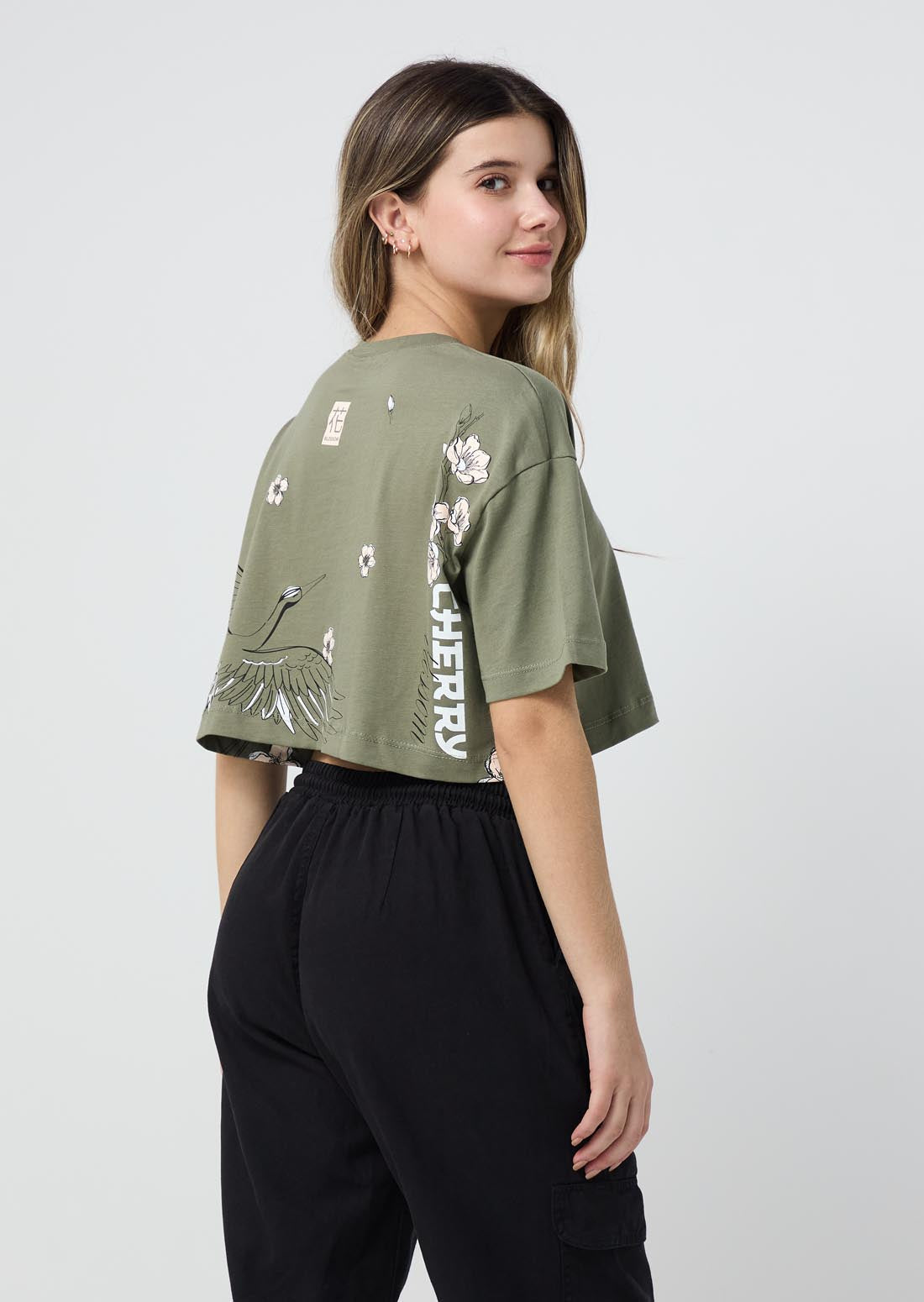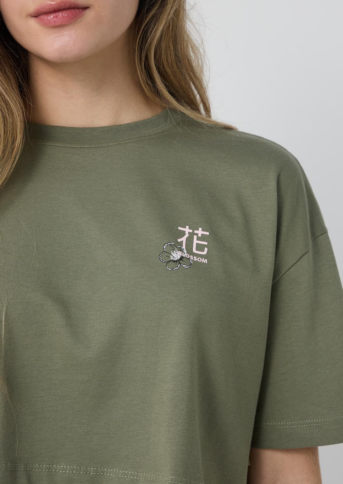 Camiseta manga corta, color verde militar, largo crop, estampado en frente y espalda para jóvenes.