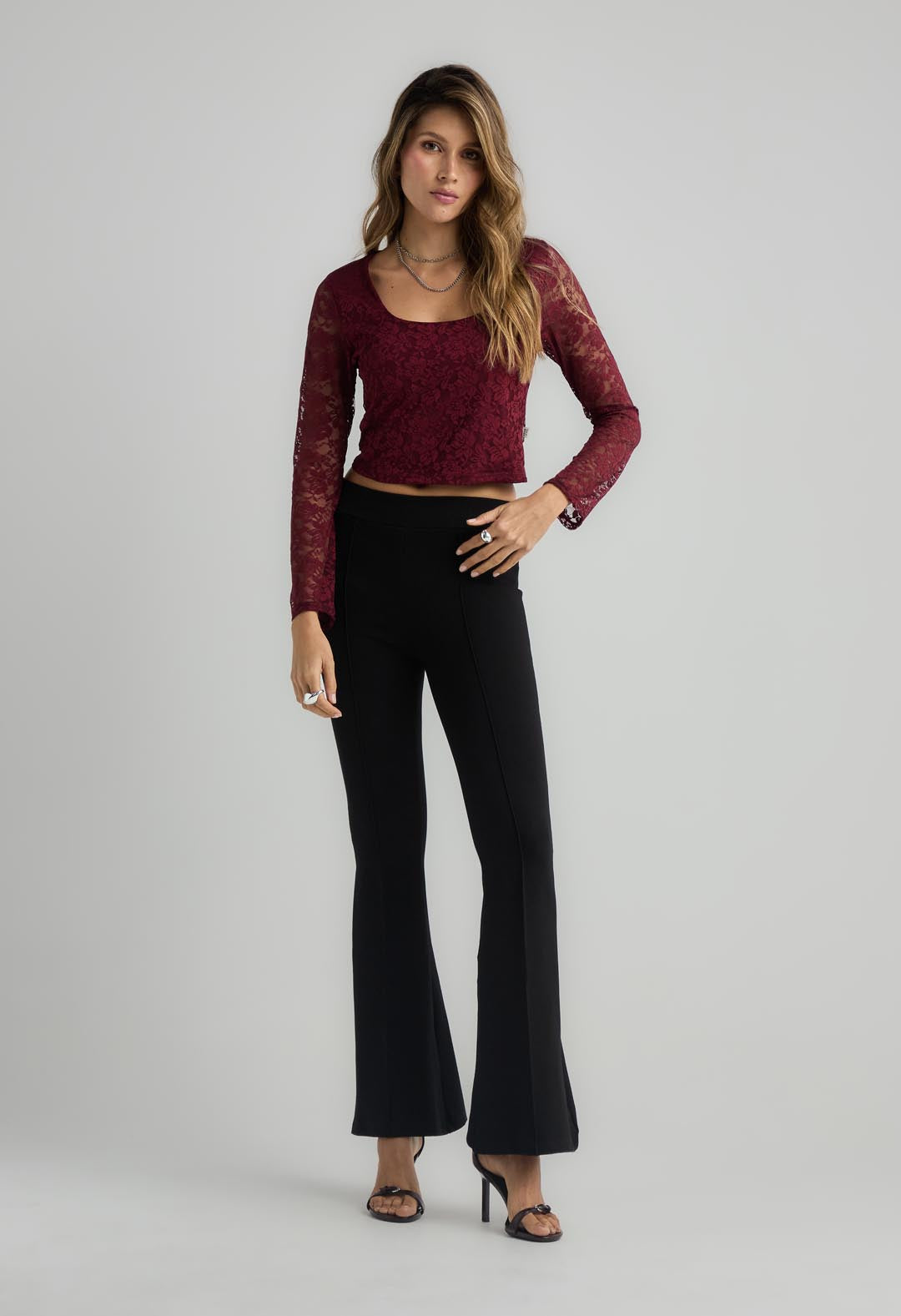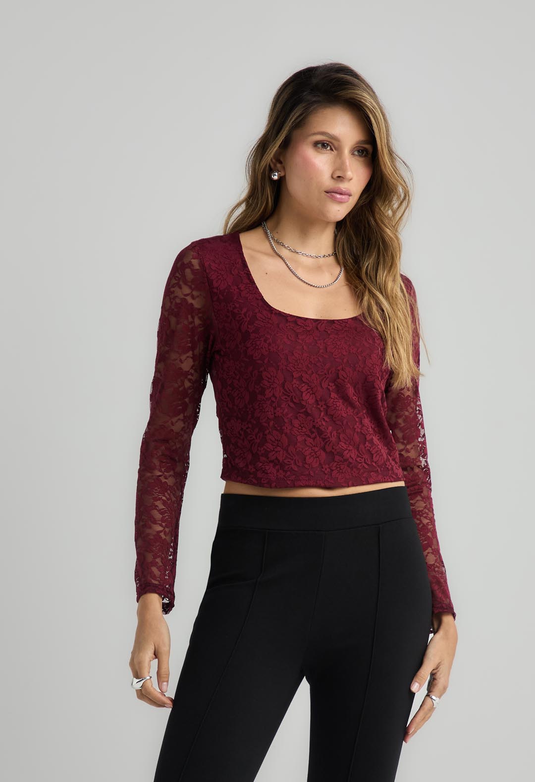 Camiseta manga larga, color vino, escote semicuadrado y transparencia para mujer.