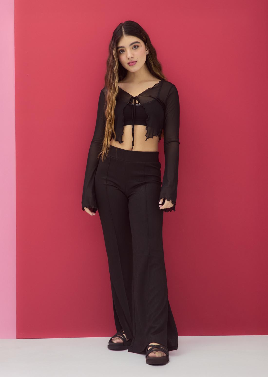 Cárdigan manga larga, color negro, con transparencias, fondo entero y tira para anudar en frente para jóvenes.