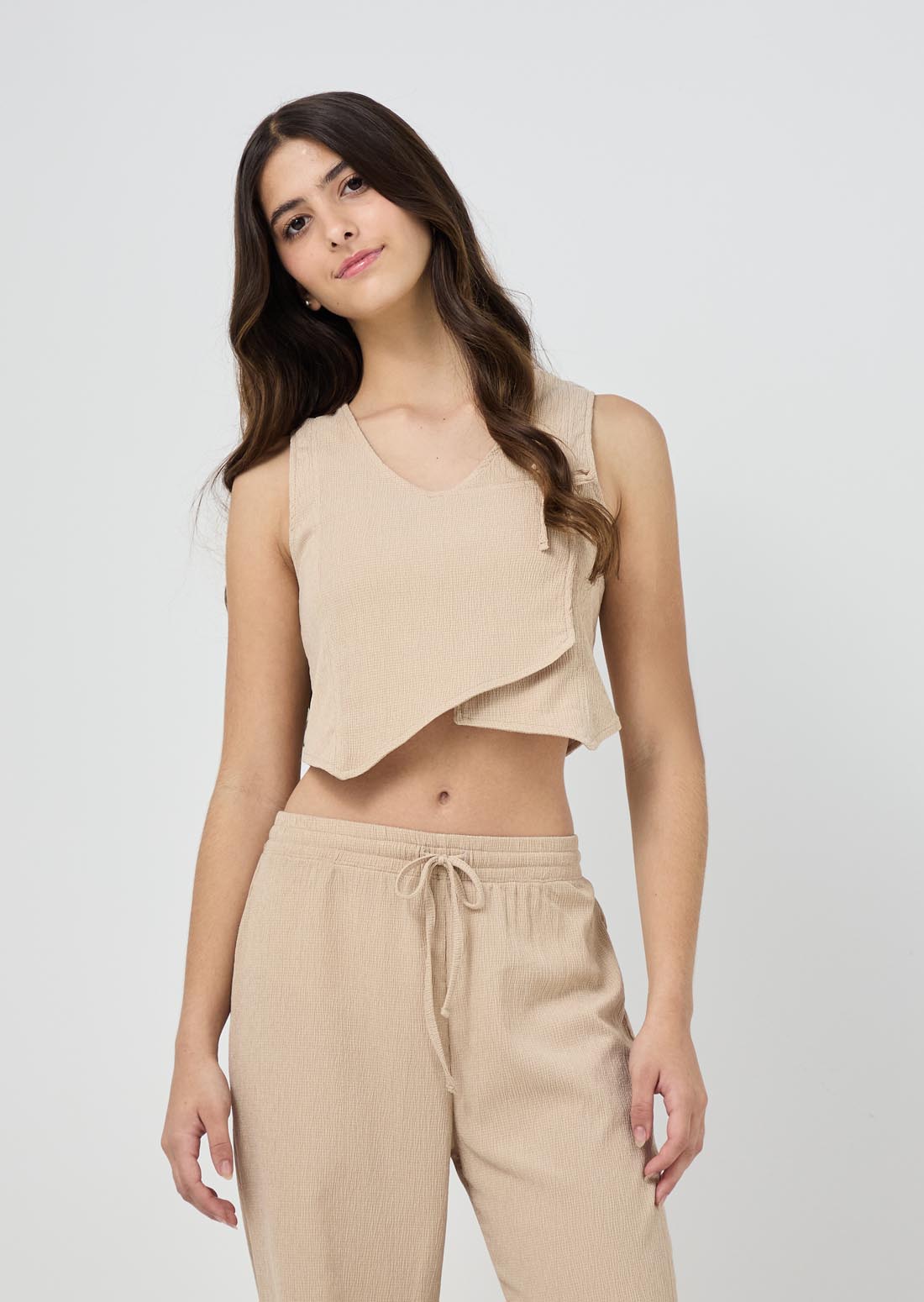 Chaleco manga, color arena, cruzado en frente y con moño para jóvenes.